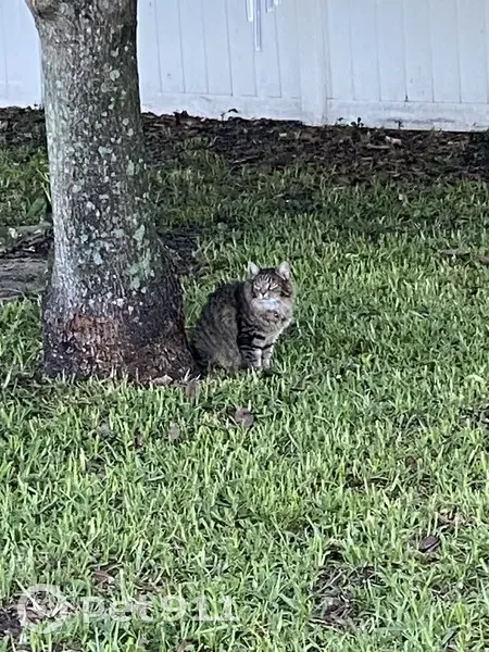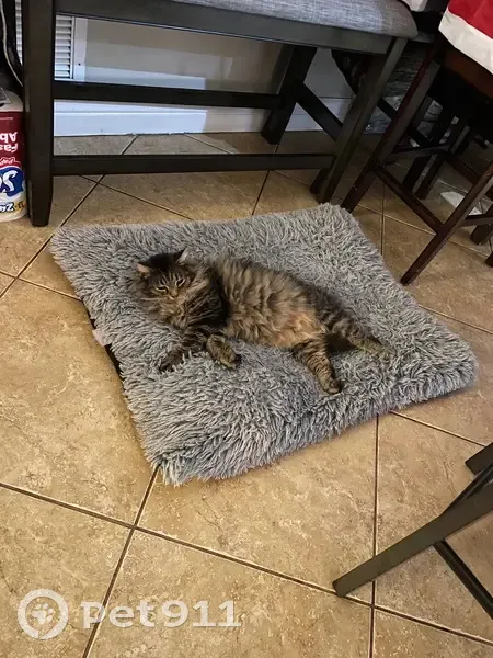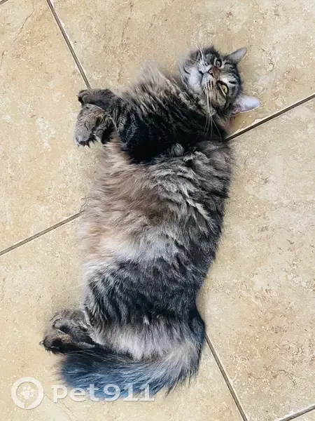 Charlie is a long-haired tabby who is super friendly and will go up to anybody. He has bright yellow eyes and has a left clipped ear. He has a collar with his name and phone number on it.