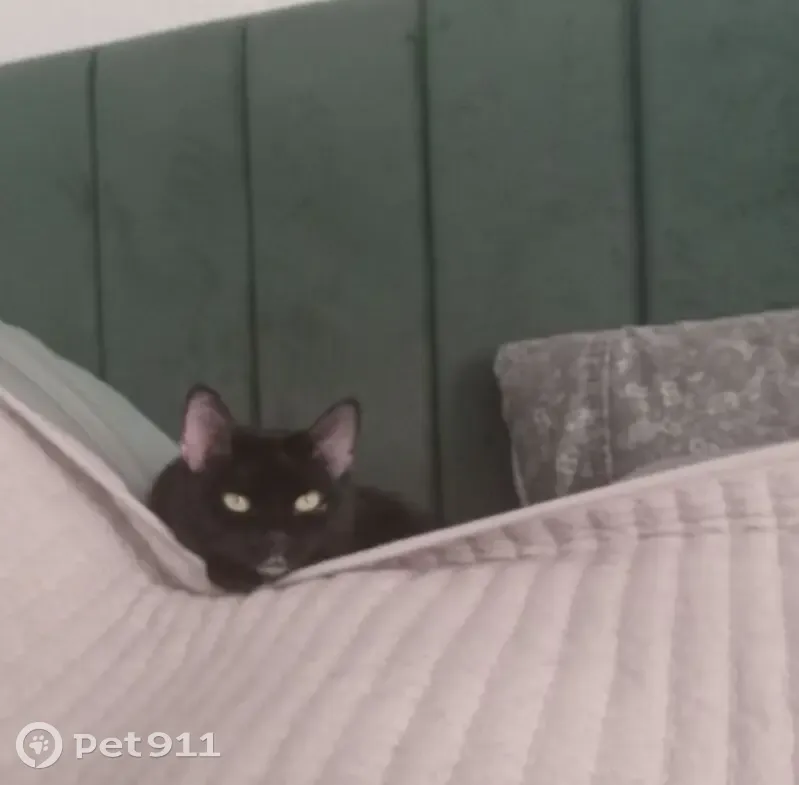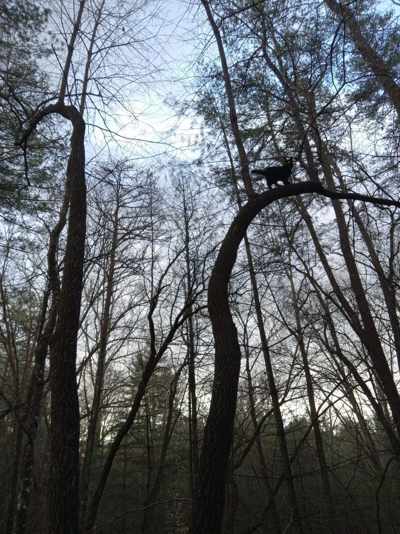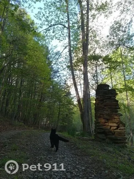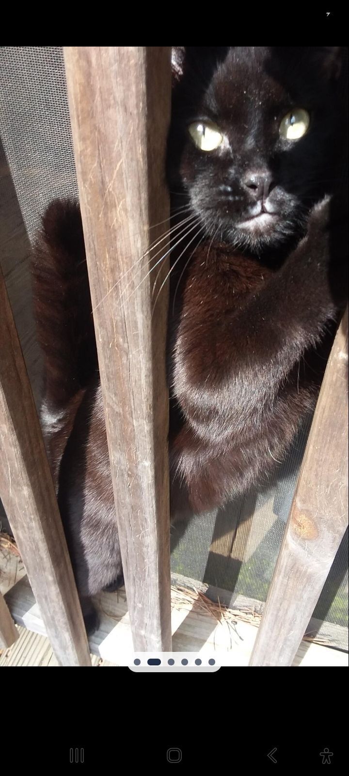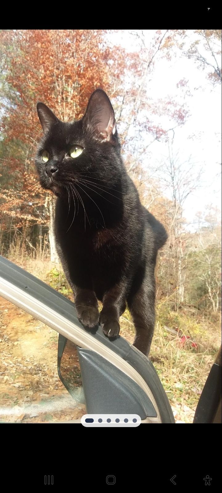 Small black cat, check in trees, stress shows up as a fuzzy very straight tail & she loses fur around her ears. Stalks bugs, loves all animals, very friendly