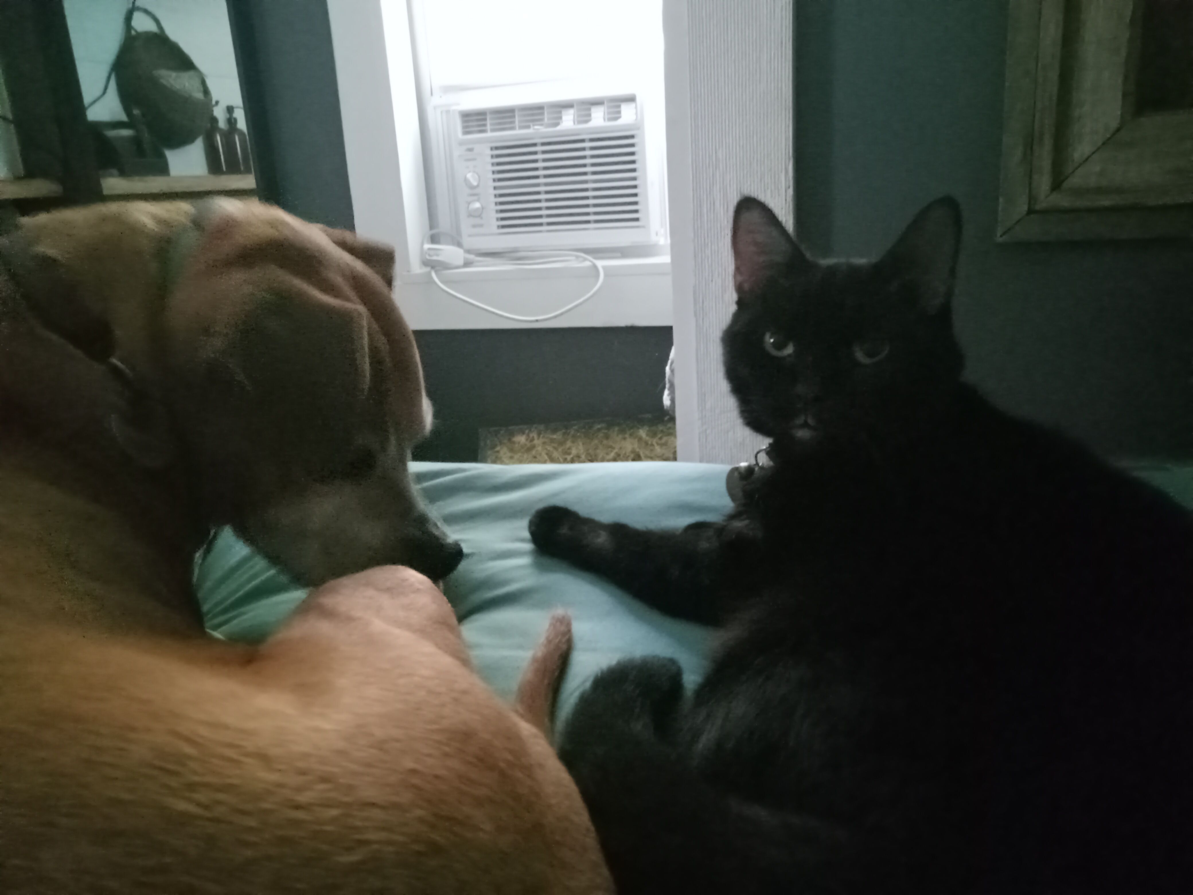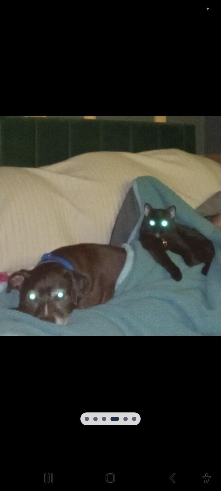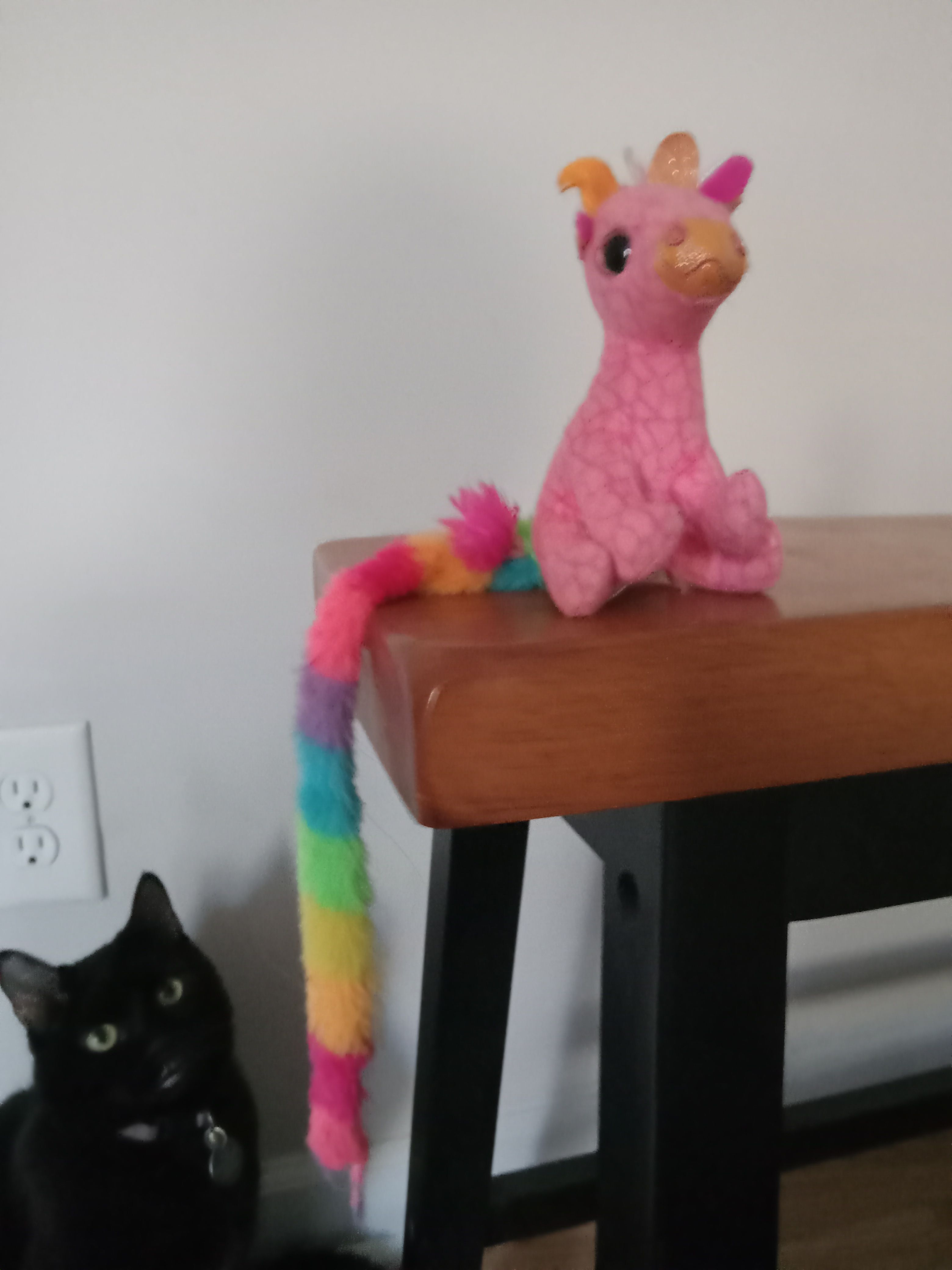 Small black cat, check in trees, stress shows up as a fuzzy very straight tail & she loses fur around her ears. Stalks bugs, loves all animals, very friendly
