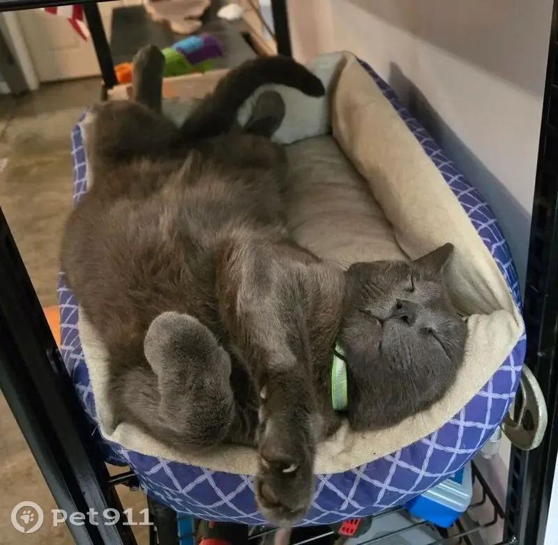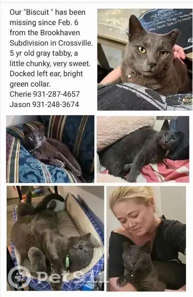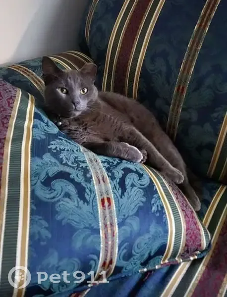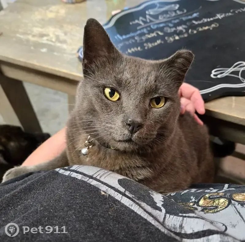 Grey male tabby cat, a little overweight, left ear is docked from when he was neutered. Was wearing a bright green collar with a bell. Bright green eyes. Very sweet disposition. About 5 years old.