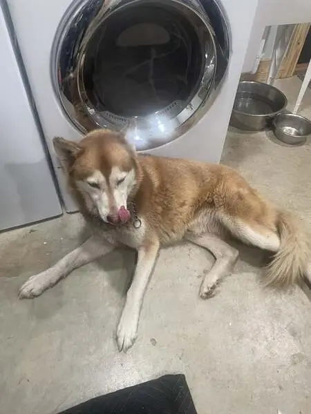 Red an white Siberian husky with blue eyes not spayed but cannot have babies she is 11 yrs old has a pink collar she is treat motivated very friendly does not bite she left during a rainstorm and I believe she lost her way