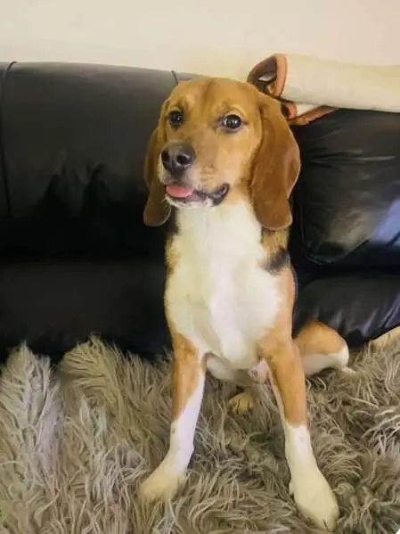 Jade is mostly orange brown with white snout and white chest and belly and her 4 paws. She has a white curled tail. She is a Beagle/doxie mix. She about middle size a bit short..