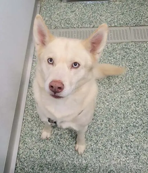 White German shepherd, small patch of missing fur on left side of body since he had a big tick we had to remove recently and had to shave his fur a little in the area. Cadillac does not like cats and he heard cats outside of the hotel room we were staying at and he somehow managed to get the door open and he ran off after the cat. He was not seen since then.