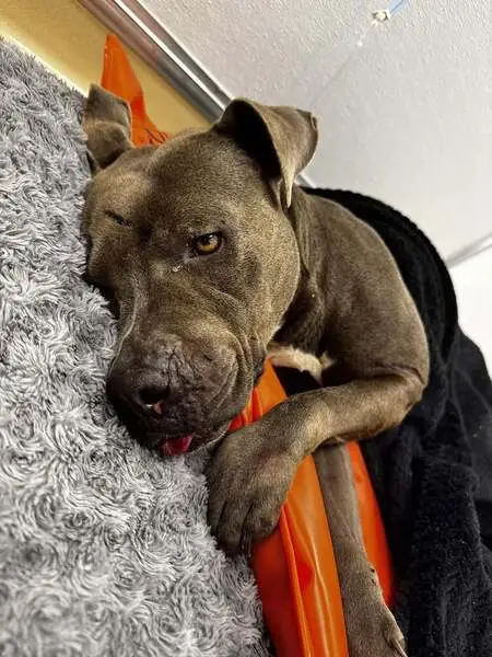 Gray with white chest staffy/pit terrier mix 58lbs 1.5 yrs old. She ran over rock wall behind my yard into millstone power plant property. Best spotting was on 8/10 on train tracks near Lincoln and Robin hill in Waterford and then on Crossroads in front of church on 8/13 round 5pm