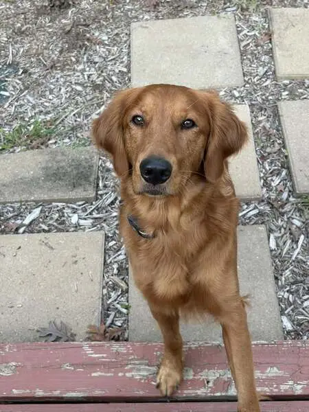 He is a golden retriever, very hairy, has a red collar, his battery ran out last night and I haven't seen him since, his name is Milo, he is 1 year and 10 months old.