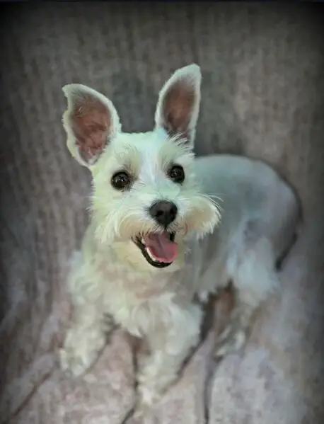 Grey schnauzer, about 15 lbs. He’s wearing a green collar with a black and purple leash attached. He also has a collar tag with information to contact Ruff Start Rescue.
