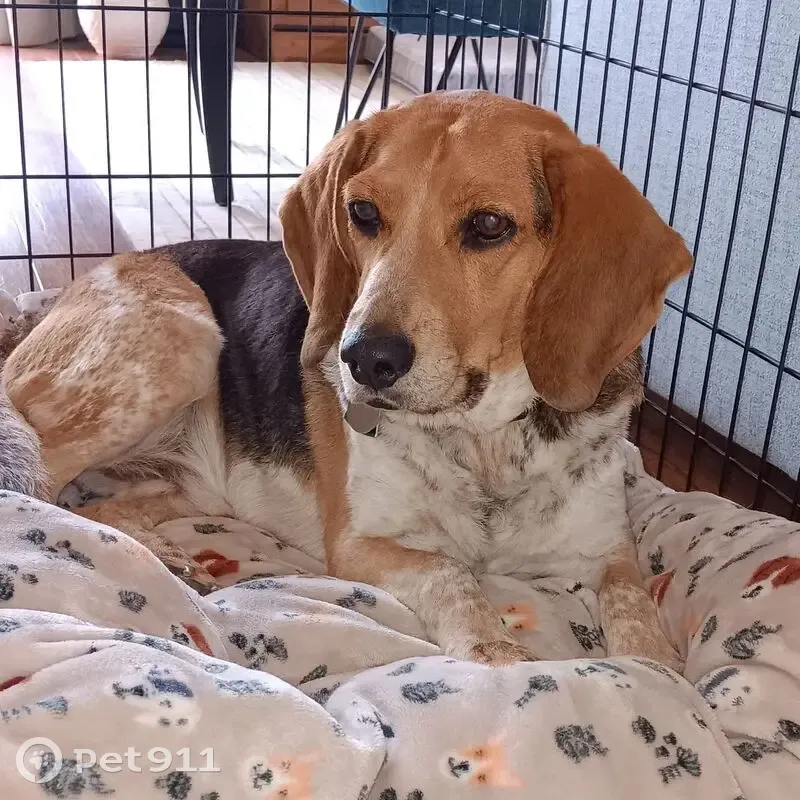 He has long brown ears. Mostly black on his back, and white back hsunches with brown dots. He is not wearing his collar. He is chipped. He is a senior dog