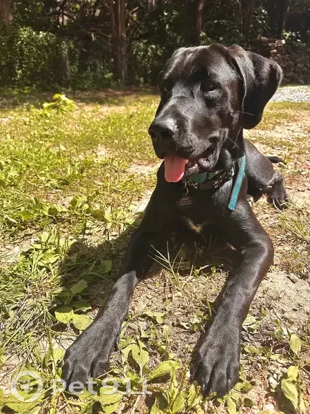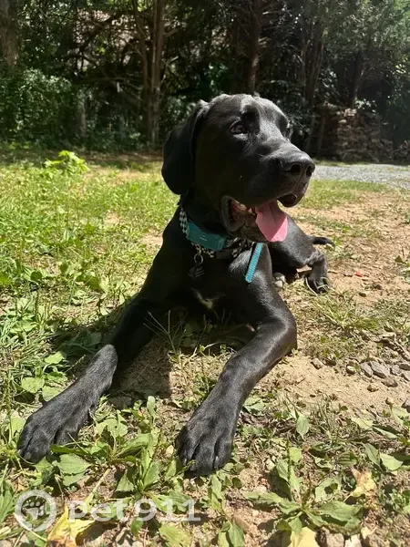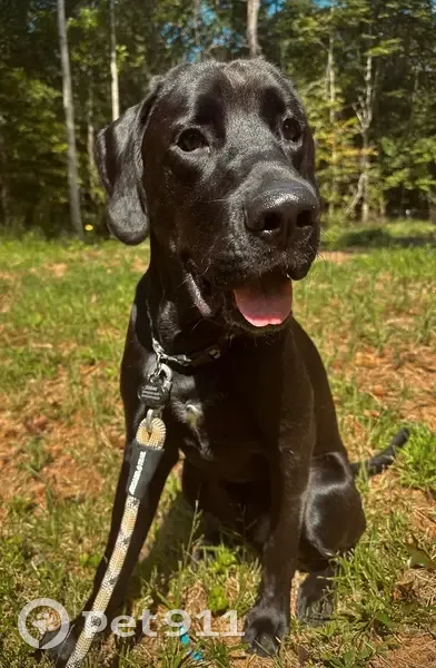 Boone is a black mastiff and lab mix he has brown eyes and a white patch on his chest. He is about 80 lbs and is with his brother Tucker that is also lost