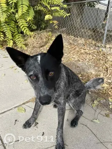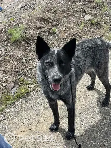 He is all blue no brown spot on his left eye his hair is semi long and very soft, wearing a brown beaded collar with his name on it . He loves to chase lights and gets overstimulated easily, when he does he chases his tail and barks or nurses his toy