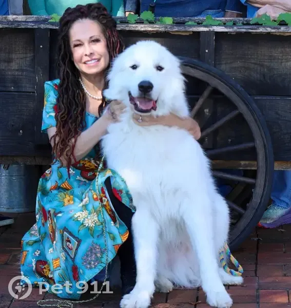 5 year old Great Pyrenees. Is a Champion show dog but is now neutered. Has a choke chain around his neck but will not let strangers pet him. Can probably be lured into a fenced yard with food. My name is Terilyn and my phone number is 927/579/4323.