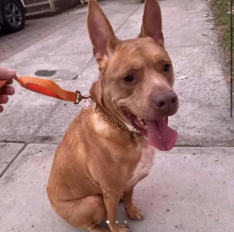 Brown, he has a white spot on his neck. He has a greenish bluish collar. It’s like a teal. He’s very sweet and he’s not mean at all He’s in perfect health. He’s just got really excited and ran off.