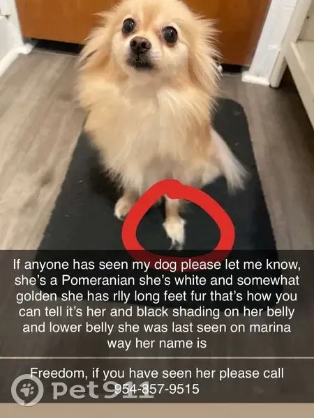 Freedom is a Pomeranian, she’s golden and beige also white her lower back is injured so it’s red and she has soft black shadings on her belly, someone left the back door to my house open but she was in her cage and we think someone must’ve came inside through the back door and took our dog, I’ve had her for 9 years about to be 10 I just really want my baby back home .