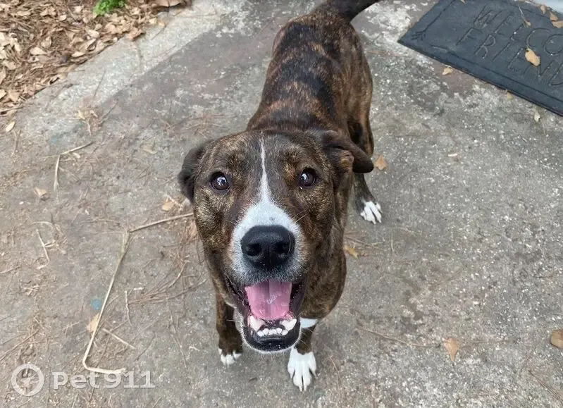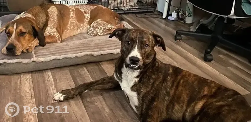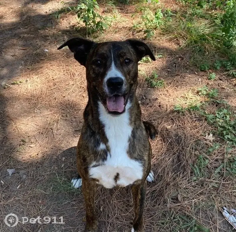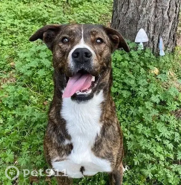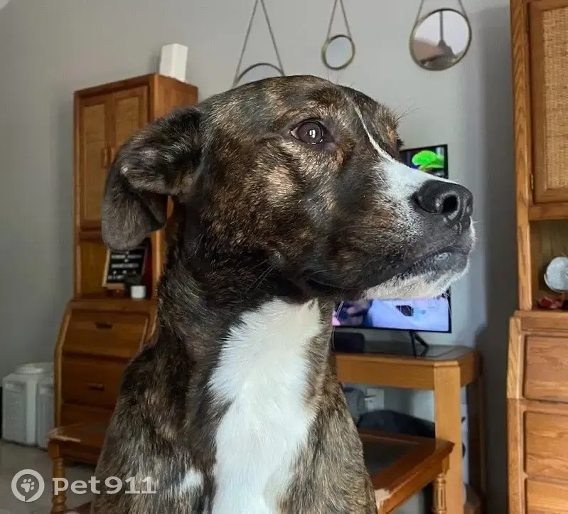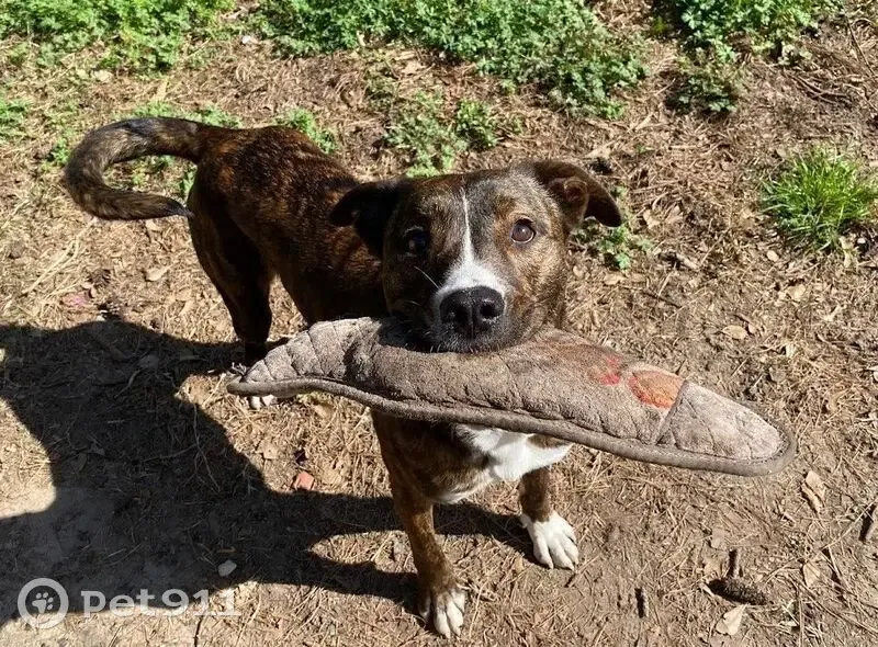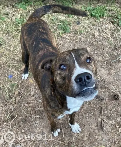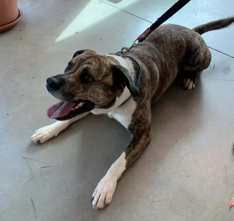 - Brown/Black brindle - White markings on chest and feet - White snip in the middle of his face running from his forehead to his muzzle - Has an underbite - Semi-erect ears - Neutered Male - Approx 60 to 70 lbs - Boxer x Greyhound-ish mix - Knows his name - Can be wary of people, is athletic, and fast - Toy and treat motivated