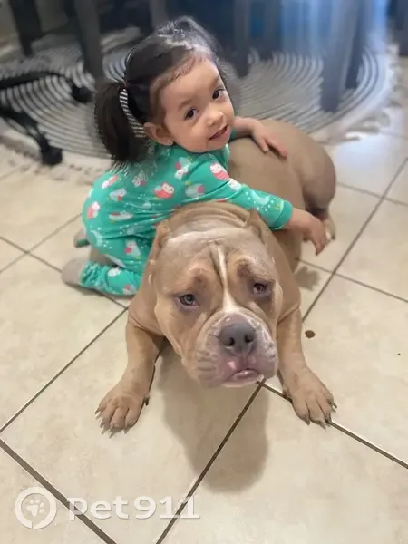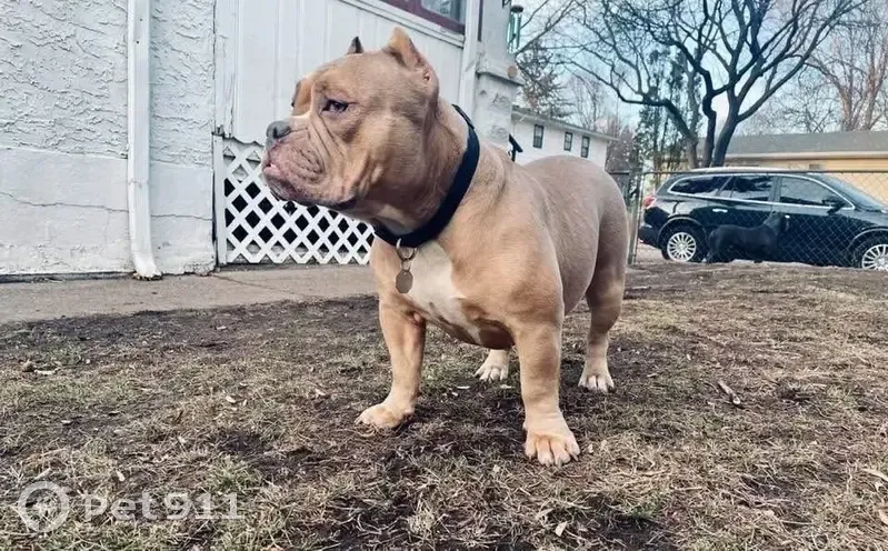 Khaleesi is a three year-old female bulldog. She is very friendly. She disappear along with her sister Bluey. Khaleesi is light brown tan with a little bit of black in her tail her back paws have white. She has a white chest, a white line in the middle of her face. Her eyes and body tend to get super red because she is very allergic to a lot of things. She has blue eyes. She also has an underbite that you can definitely tell.