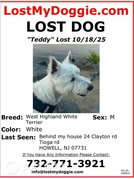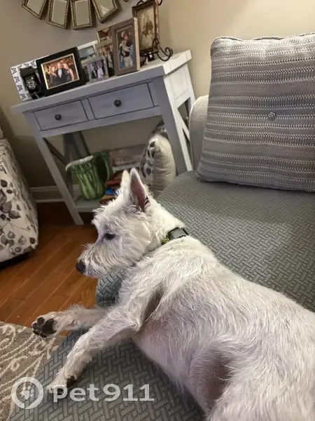 White dog just had a hair cut so his fur is short. Slipped his collar so he has none on when he saw a deer in the yard into the woods and field behind my house. It was dusk and I couldn’t find him.