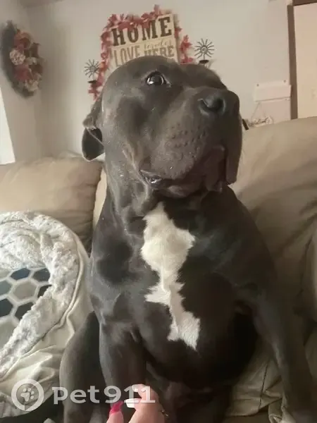 Blue American bully- good with humans hates cats! He got out from a privacy fence when the neighbors dogs ran up to my fence. Lady dog was in heat. Go figure…. Short and stocky has a heart condition.