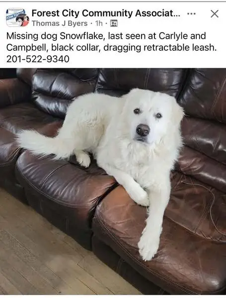 Fluffy white coat, about 80 pounds, friendly but she he is an active and working livestock guardian dog so will bark. DO NOT CHASE! Red collar under fluff with tags, microchipped. Grey ears.