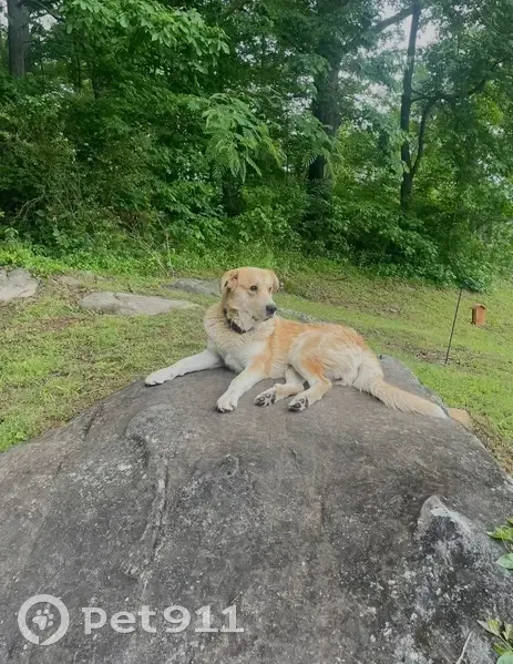 Light tan Great Pyrenees mix, he has a dark brown/black collar with a blue tag shaped like a dog bone. We went to bed and he was here on the porch and got up the next day and haven’t seen him since. He could be in the suck creek mountain /mullins cove/ prentice cooper area.