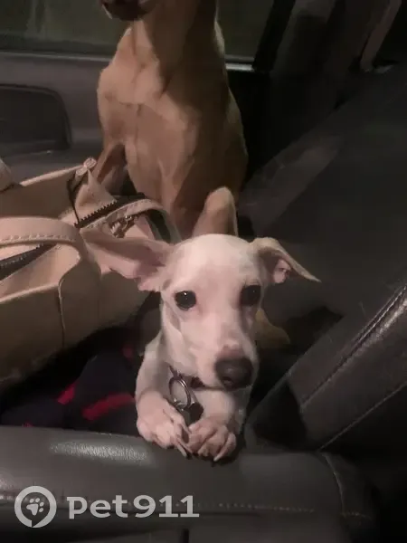 Princess is a mostly white jack russel with few orange and black small spots she has a purple collar and Fido Tag she has a small cut on left ear from when she was puppy