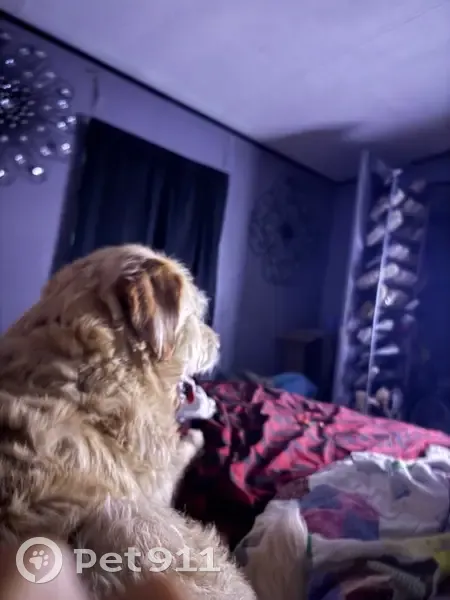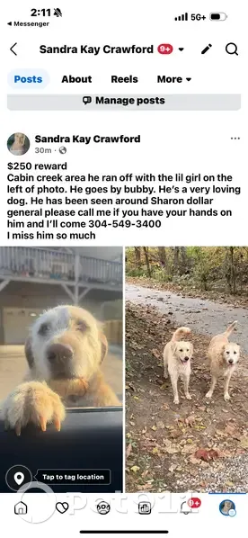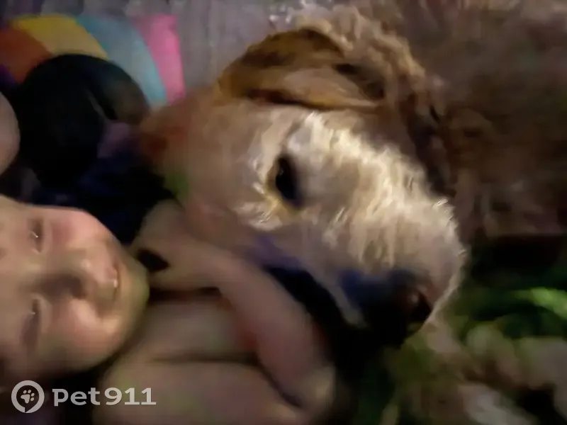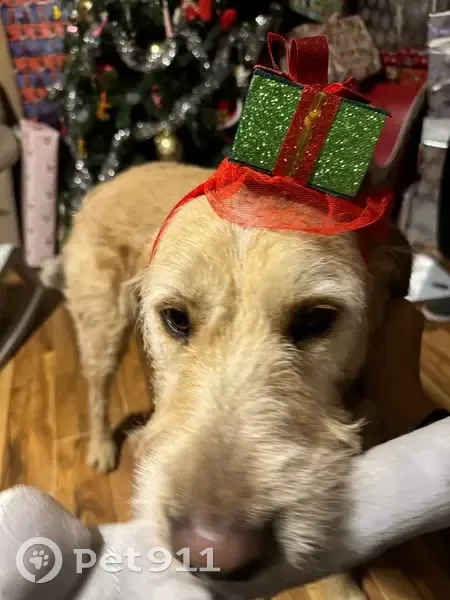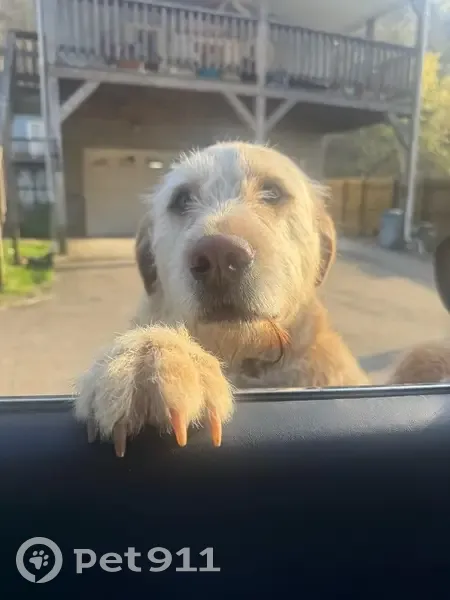 Light brown with a white stripe that comes down his nose. He’s taller than a normal lab he looks almost somewhat like an Irish wolfhound thicker fur and bigger. He’s very loving he don’t know a stranger. He has a deep bark. Scared of storms.