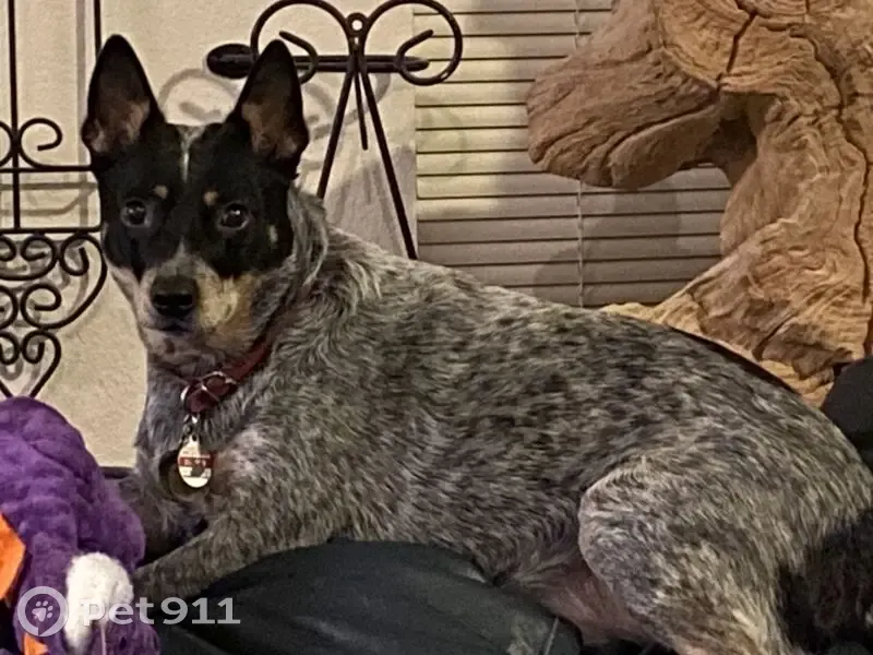 Merged with usl523786 listing. The reason is duplication of information. Description of the duplicate listing: Red collar, has tags, full black mask and ears, gray speckled body with two large black spots, Australian Cattle Dog female, shy or fearful with strangers, has all shots