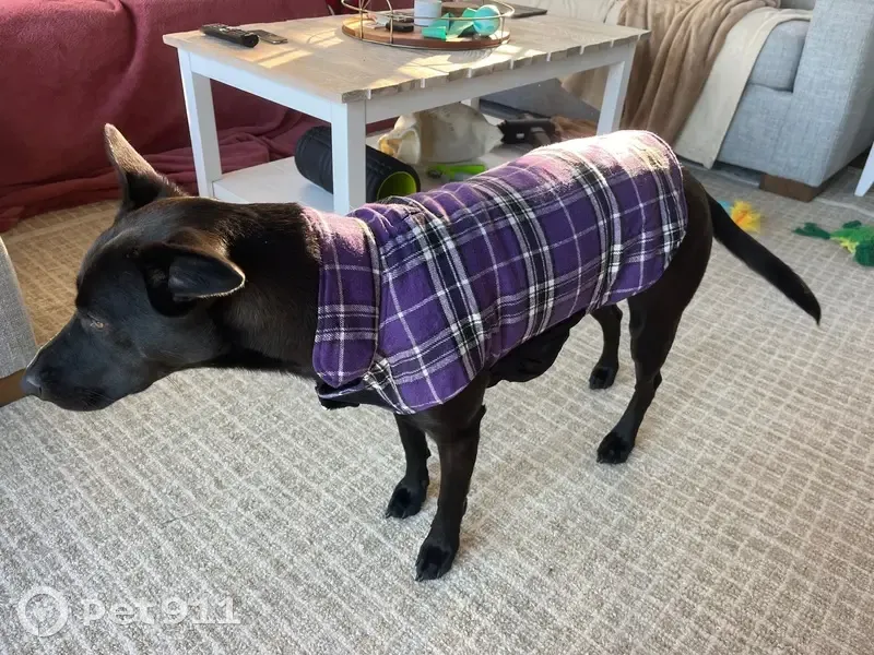 35-40lb small/medium black dog wearing a purple coat. She is scared and will likely be running or try to run if you call or chase her. Please just call if you see her.
