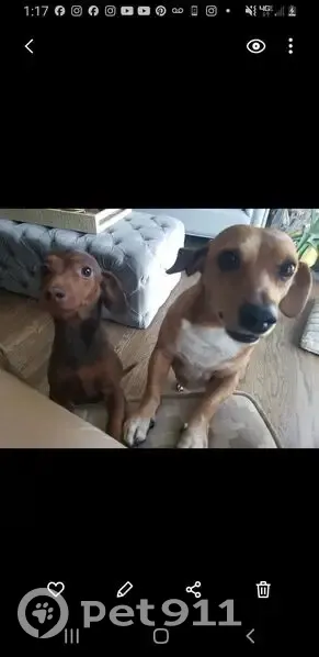 Tan short-haired dachshund mix. White chest and front toes. Deep brown puddle eyes. Wearing a thin black collar but no tags :(