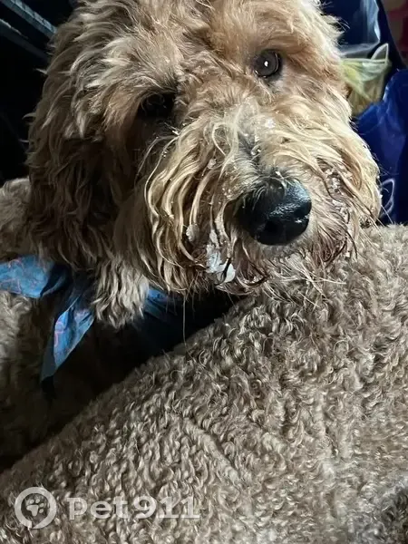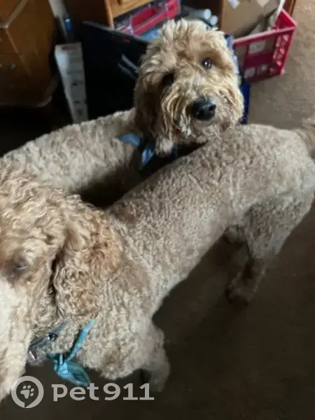 She’s a standard brownish golden doodle. She ran outside the gate and didn’t come back. Her fur is shaggy and she had a collar on with tags of shots and if lost. Her name is Jasmine and she is a very sweet natured dog. There is a reward if found.