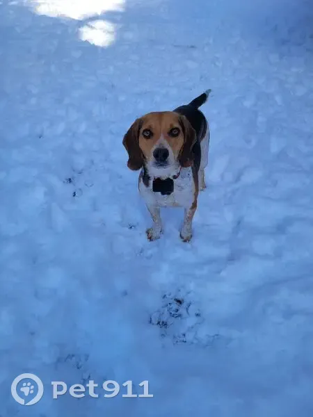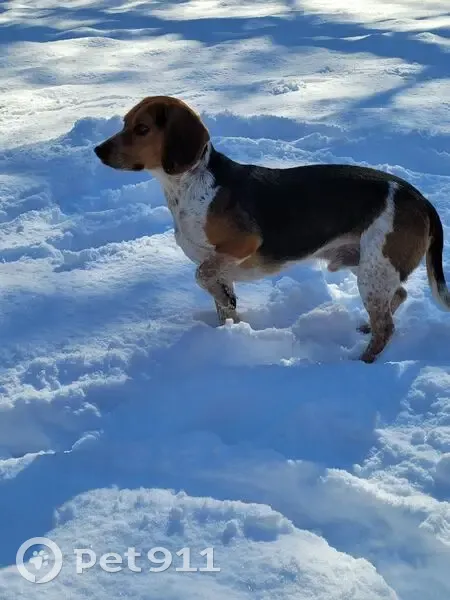 Beagle, with spotted white fur, not a hunting dog. 2.5 years old. Around 30 pounds. Short legs, long body. He is wearing red petsafe collar but no id tag. He is still intact. He got out of the electric fence boundary.