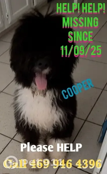 BLACK DOODLE MIX WITH WHITE ON ALL 4 legs I guess Cooper must have left out back with the rest of my dogs cos the fence was slightly pushed open. I am guessing he got spooked my the neighbor’s pitbulls and ran while my other dogs came back without him .