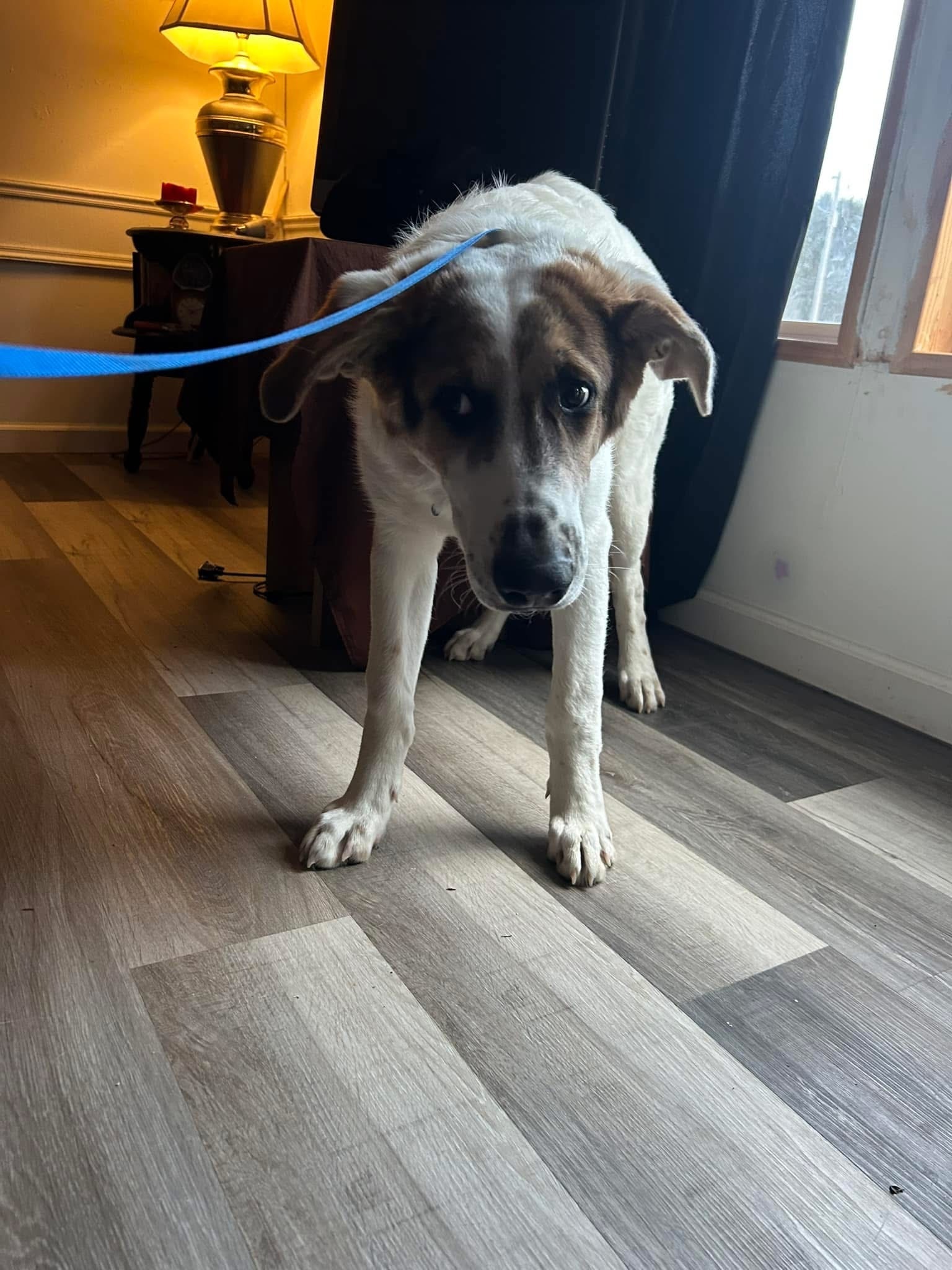 He’s deaf , white with brown on his face a spot on his back and tail, he jumps out at gas station wouldn’t come and we had an unmissable appointment we come back later and couldn’t find him