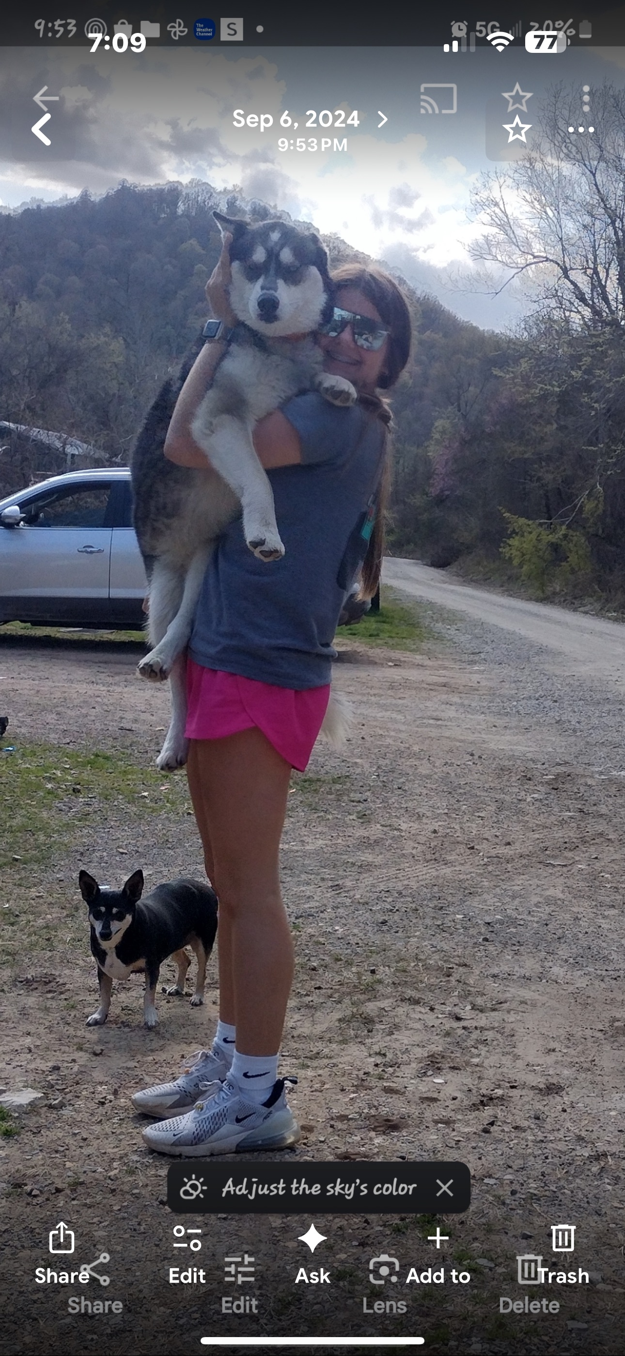 She nice friendly dog she takes off and wonders when weather cools off but usually she is back home on the 3rd morning scratching at door she is chipped and if located u can take her to animal clinic across from 101 in Flippin or call 8708410223 no collar she escaped it she hates being on cable or pinned up very Houdini like can escape and open doors to houses very smart girl.