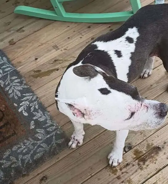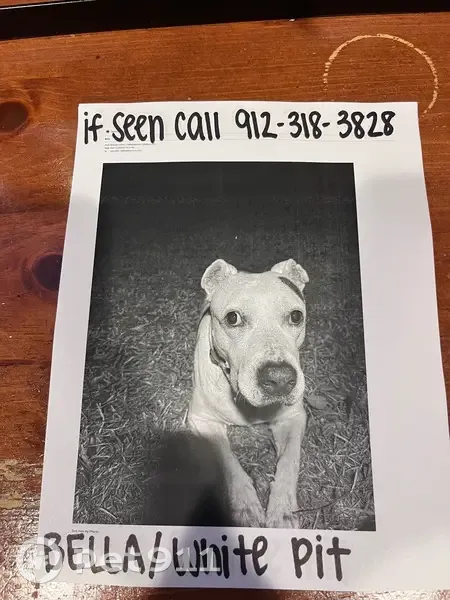 White pit mix with brown spots. Purple collar. Microchipped. Friendly. Last seen in long acre estates and ran off into the woods. Name is Bella or will come to Bella Michelle and loves “cookies”. Her eyes kinda go outwards.