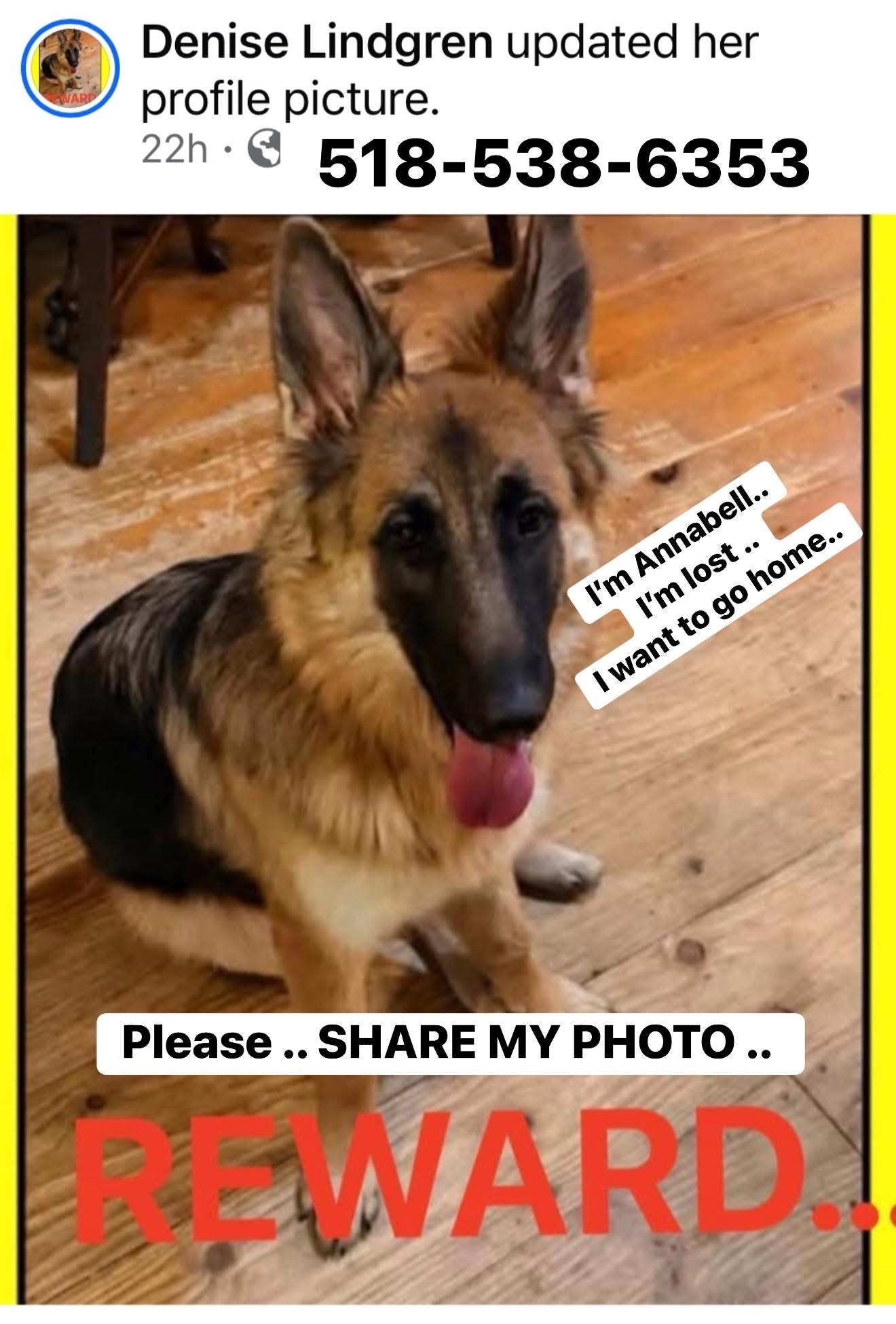 German shepherd 10 months,went into woods with our other dogs .. They came back she didn’t.. Next to our home .. Believe got lost .. And some picked up near road