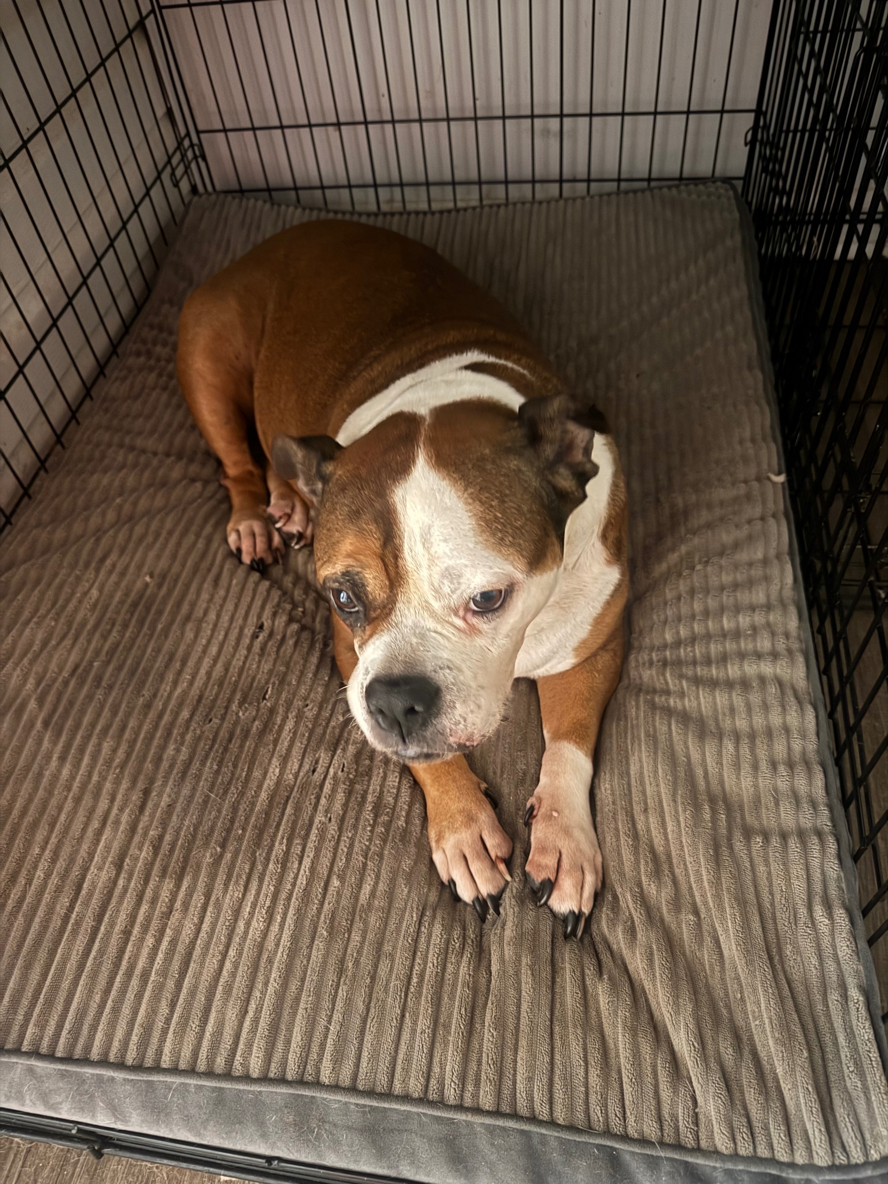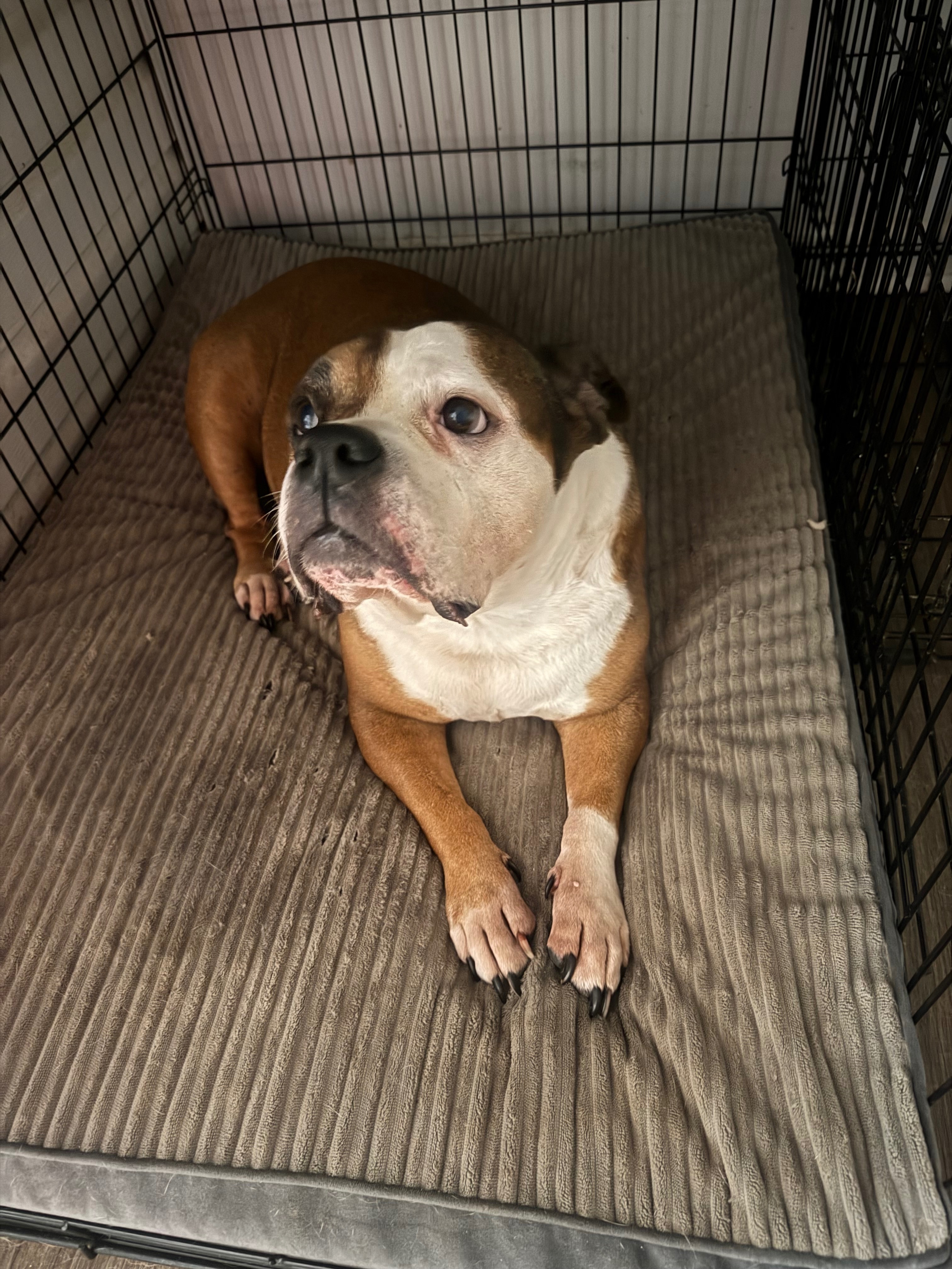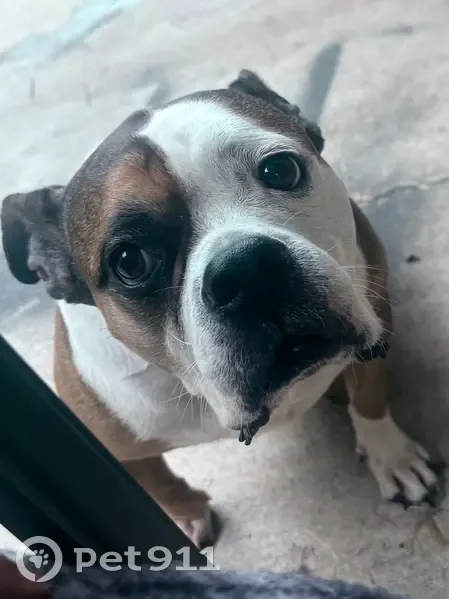 Escaped from home she is a short English bulldog that’s never missed a meal, she’s as sweet as can be and is practically deaf and blind. She is 13 years old and is loved and missed dearly.