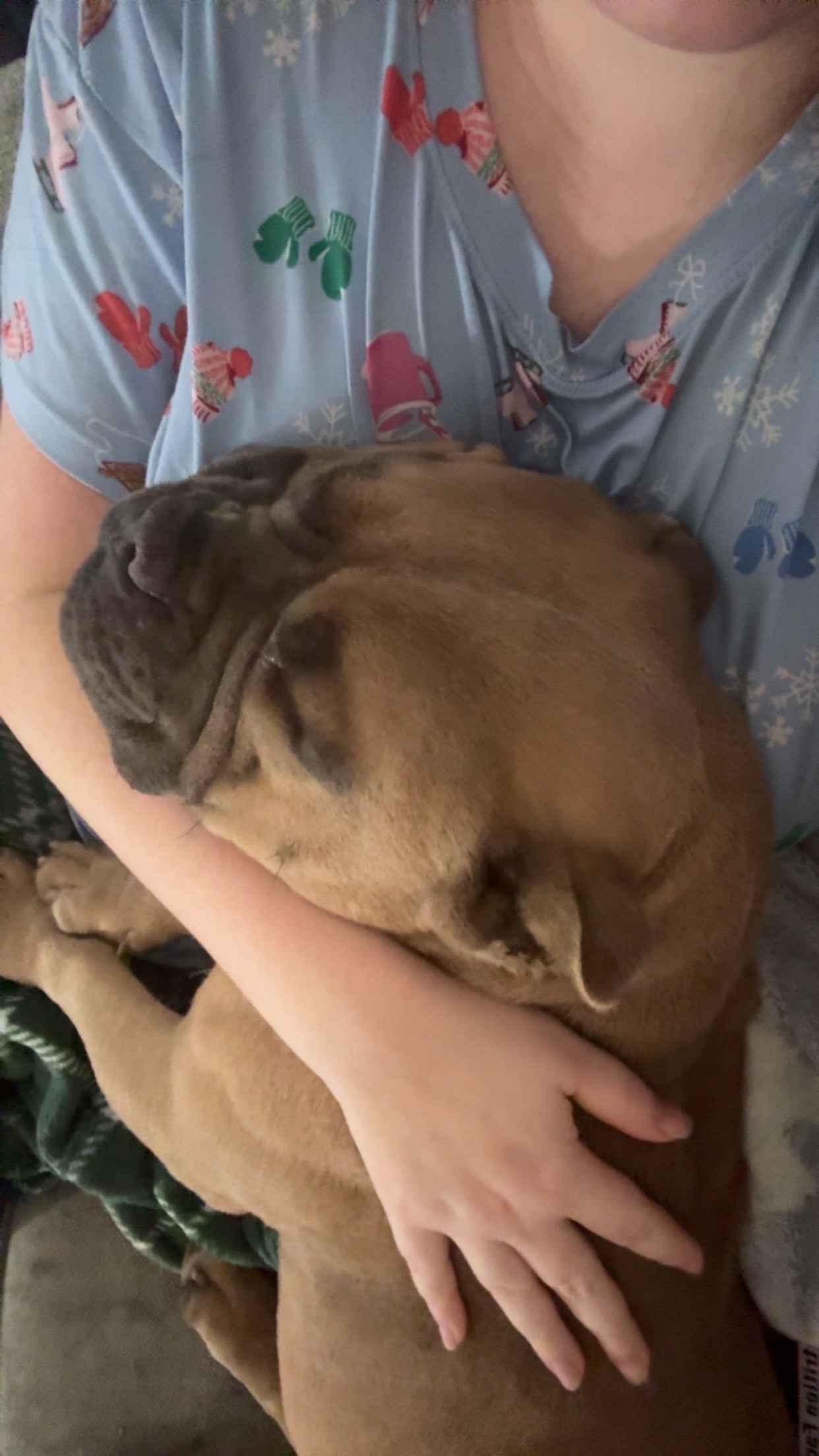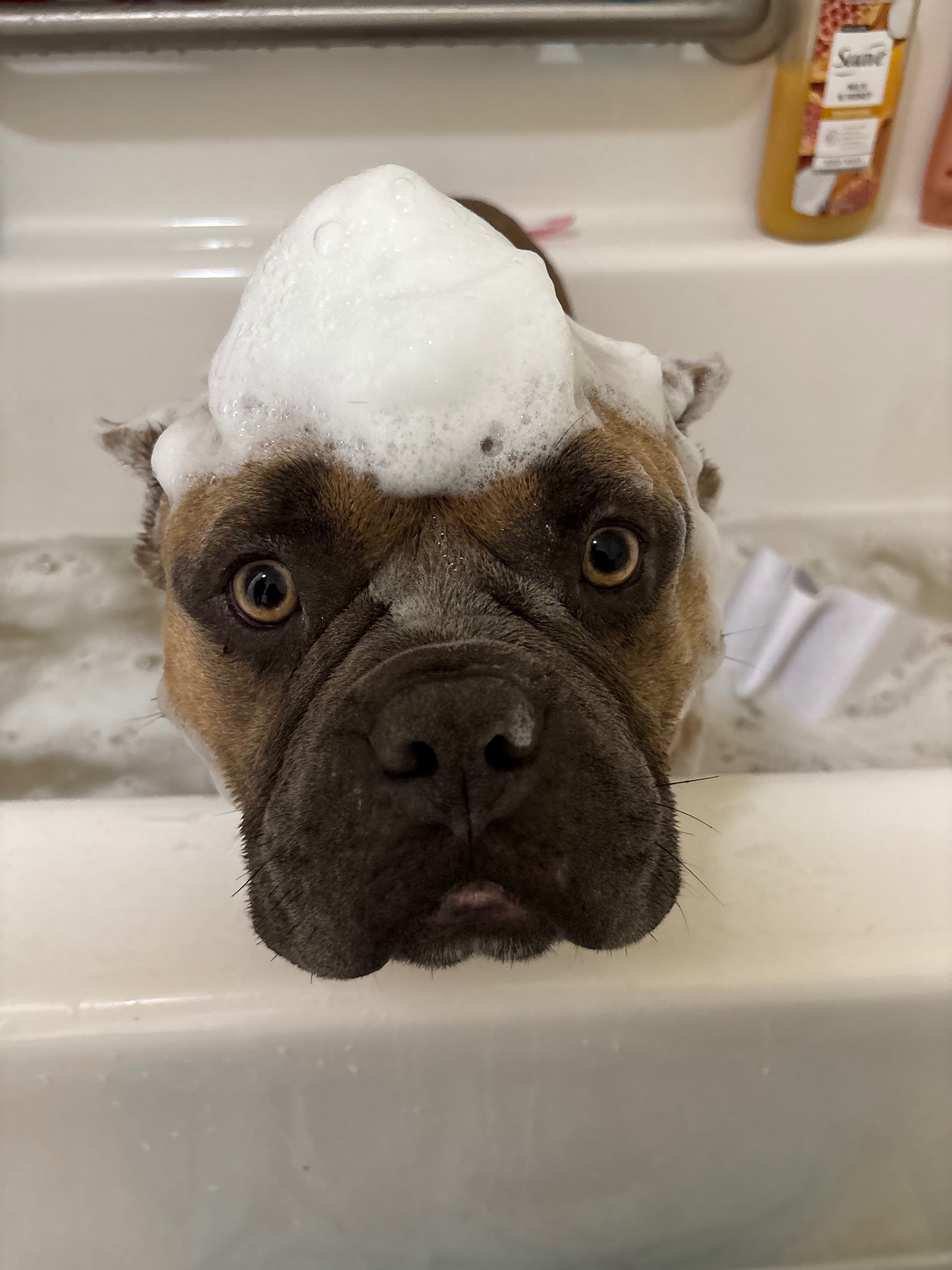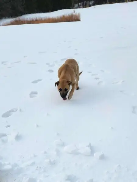 He was laying on the back porch and we went to let him inside and he was gone! He’s tan with black on his face and white on his chest!! He might growl or bark but he is the sweetest baby!!! We also call him fat boy so he may respond to that better!
