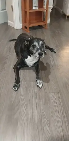 He’s 16 years old. Has a brindle coat with 4 white paws and a white chest. He’s a sweetheart and I’m sure very afraid that he can’t find me right now. He will answer to his name and be friendly to any and everyone.