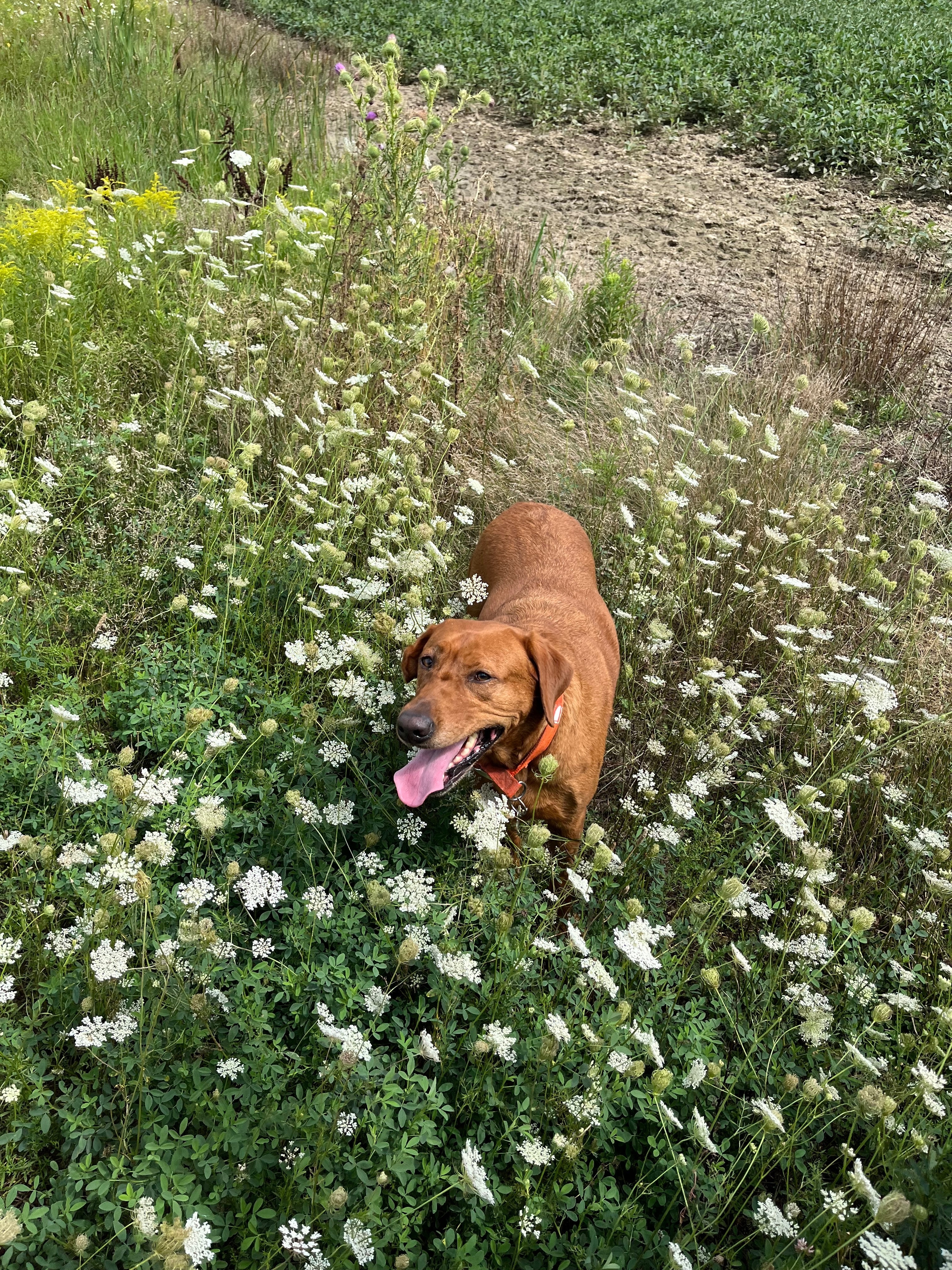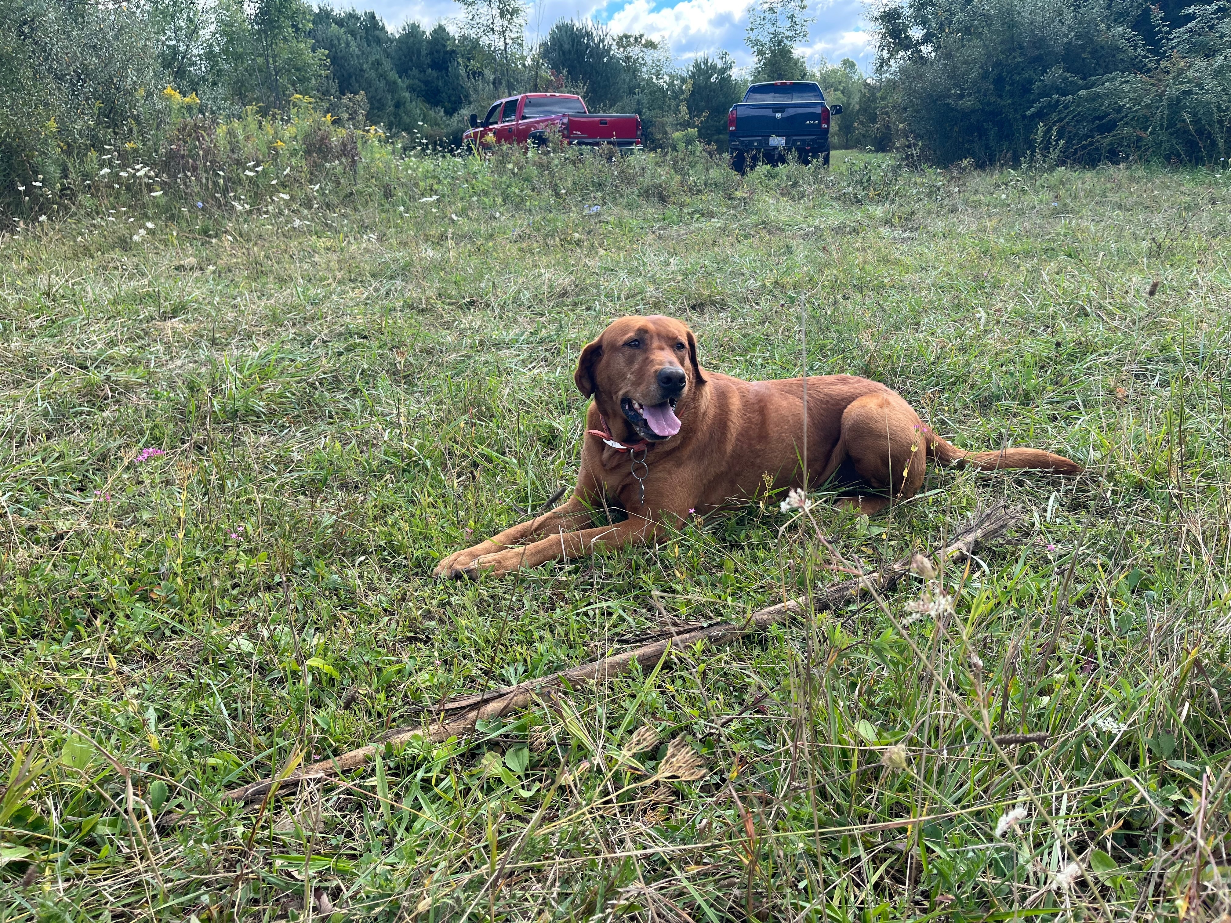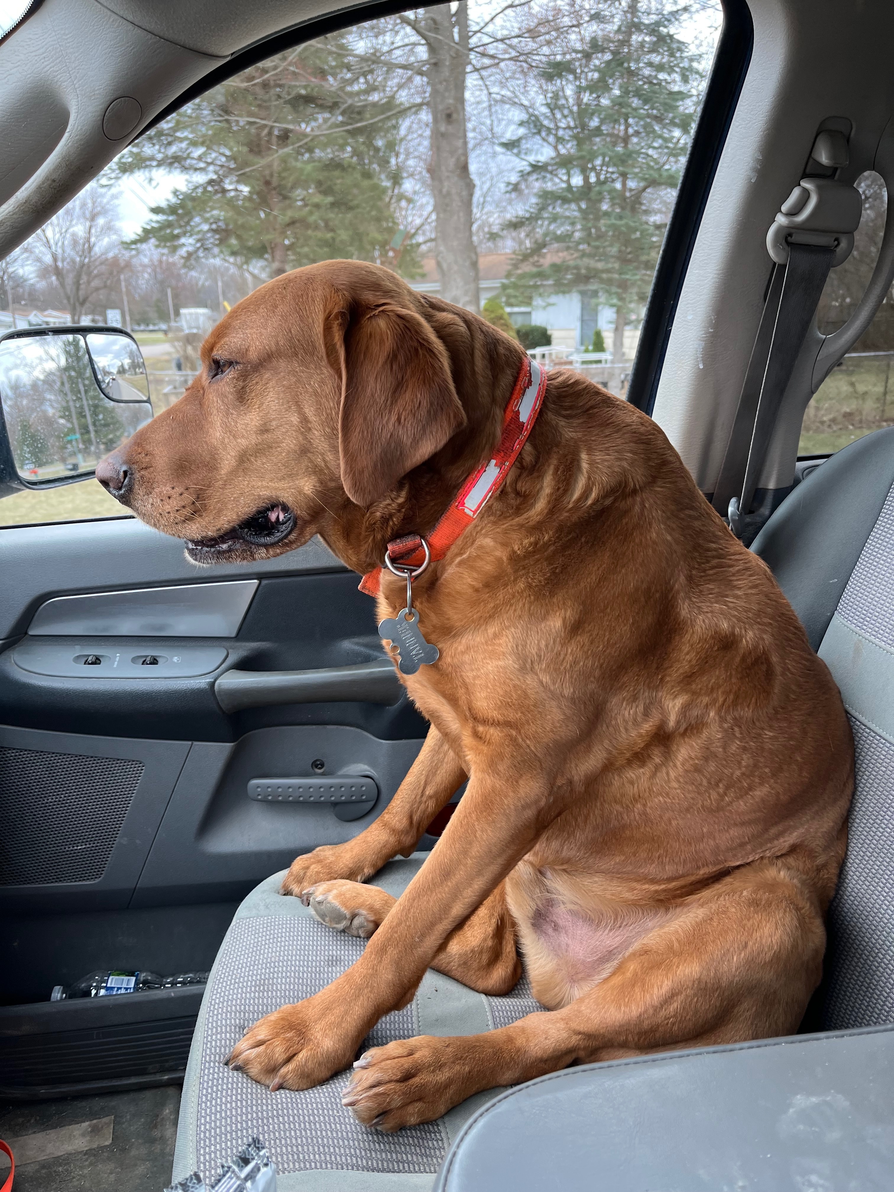 Tanner is a pure red lab. He’s got an ear hematoma on one side. No collar. 6 years old. SUPER friendly. He has always been a wanderer , never too far though. Calling him by his name he’ll come right to you.