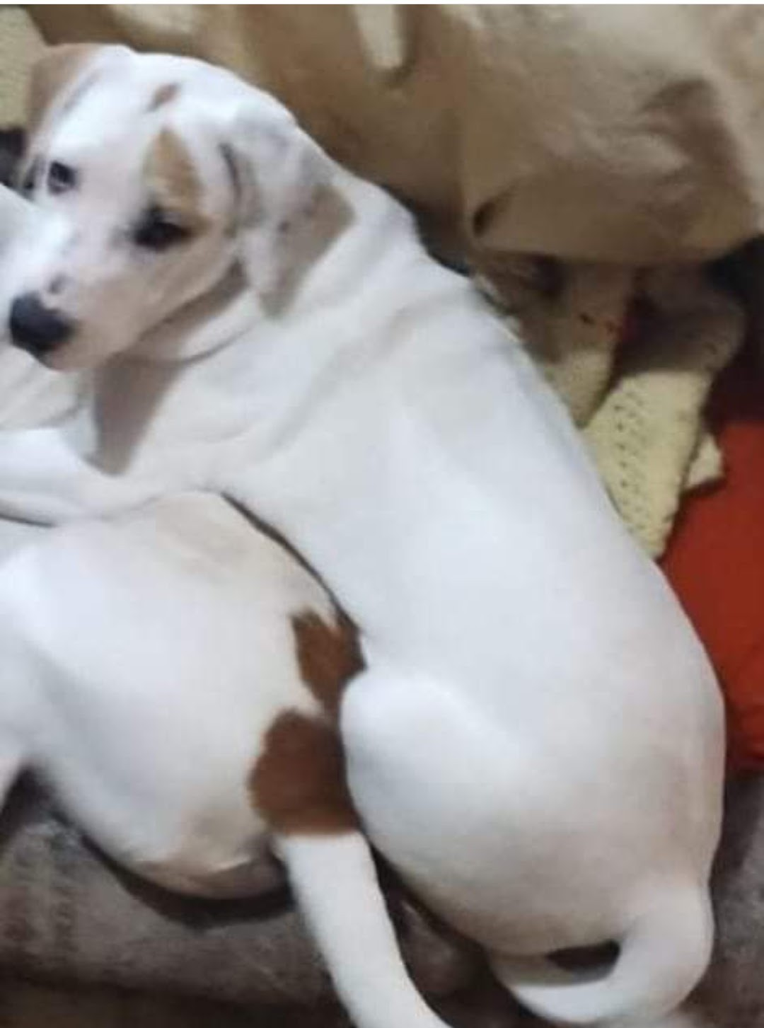All white coat, with a red-orange diamond on top of her head of spot above her left eye her right ear and some spots on her left ear and a black little black dot on the bridge of your nose