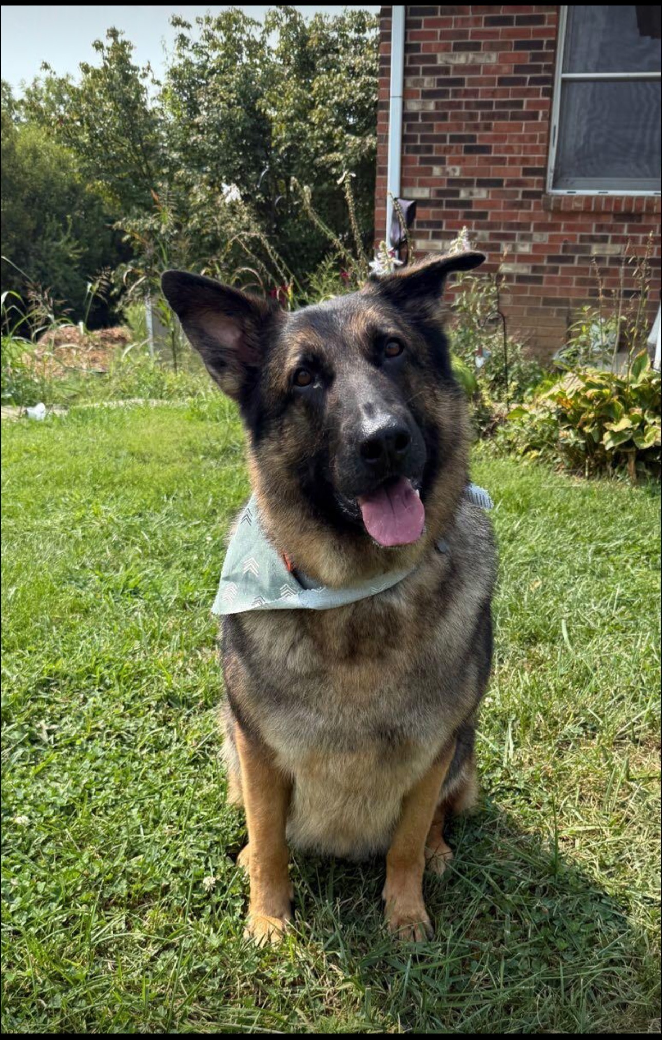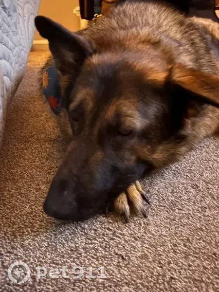 Wolfie has a floppy ear, he is about 130 pounds but he has been missing since the 11th so he may be skinnier. He has a King Shepherd so he's bigger than most German Shepherds. He is a very friendly dog, but he may be in survival mode and be scared. We have seen sightings of him in our area, but no one has been able to confirm a picture of him yet. We are offering a cash reward for his return. My husband is a combat veteran and this is his service animal.