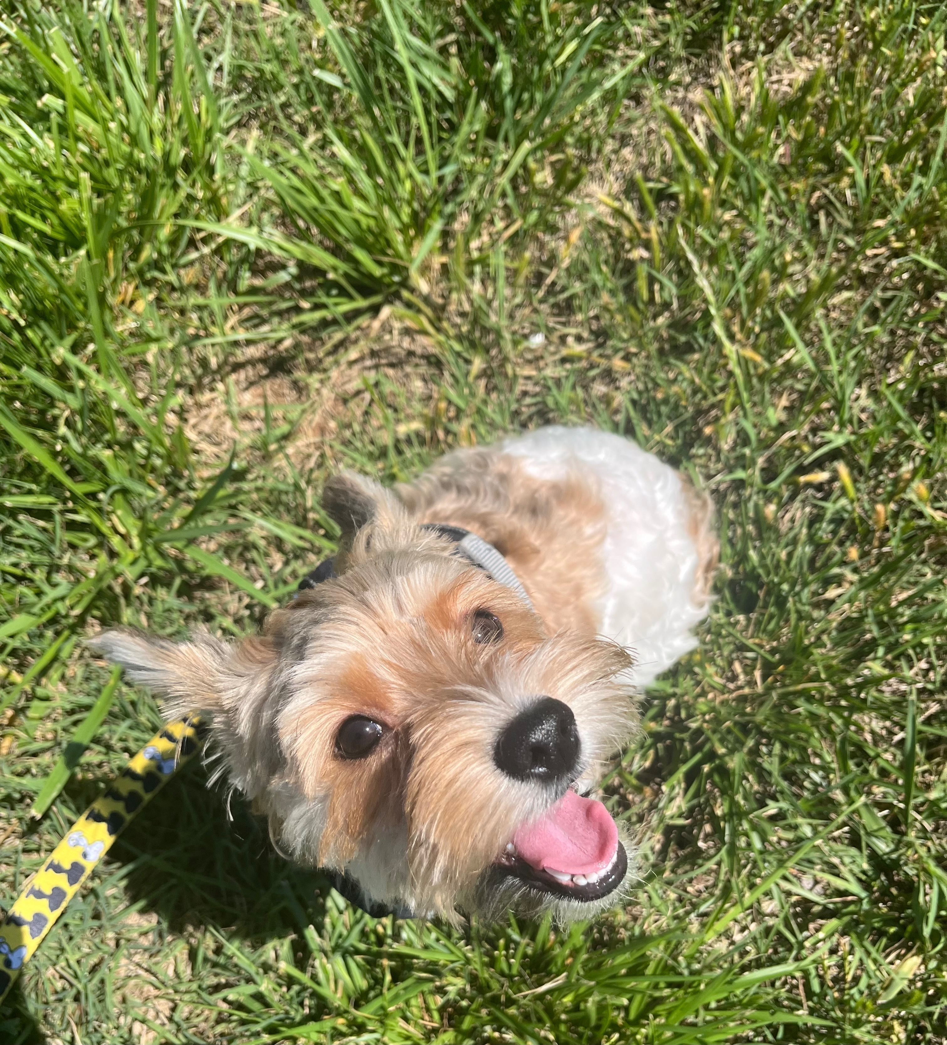 White, tan, brownish. Very sweet but can be skiddish of people! Loves treats! Will definitely come to you if you have treats or bones. His paws are black and pinkish. If he barks at you he’s just being a butt. Will never bite.