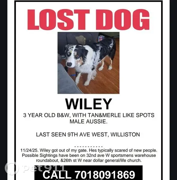 Wiley is a multi colored aussie, 3 year old in tact male. Wiley is my brothers dog who lives in forsyth, MT him and his family were visiting me in Williston. ND for the holiday, wiley got out of my gate when kids were playing in my backyard. We havent had a single sighting of him since his disappearance. He had a collar on with his owners number on it, if hes still wearing the collar thats unknown. He is typically skiddish of new people or people he doesnt know. He loves his family and his family loves him.