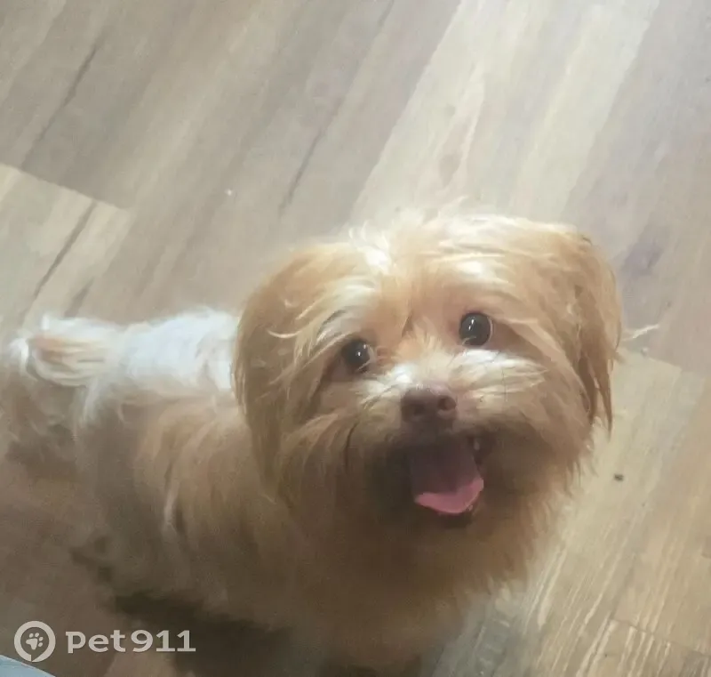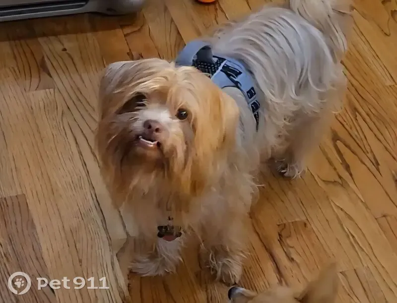 Blonde shorkie, 2 years, gray halter with tags, hand grip on top. Arrived to visit daughter at night, he ran out door while unloading car. Son in law tried to catch him and he ran. He had never been outside alone. Uses pee pad at home in GA. Very pampered.