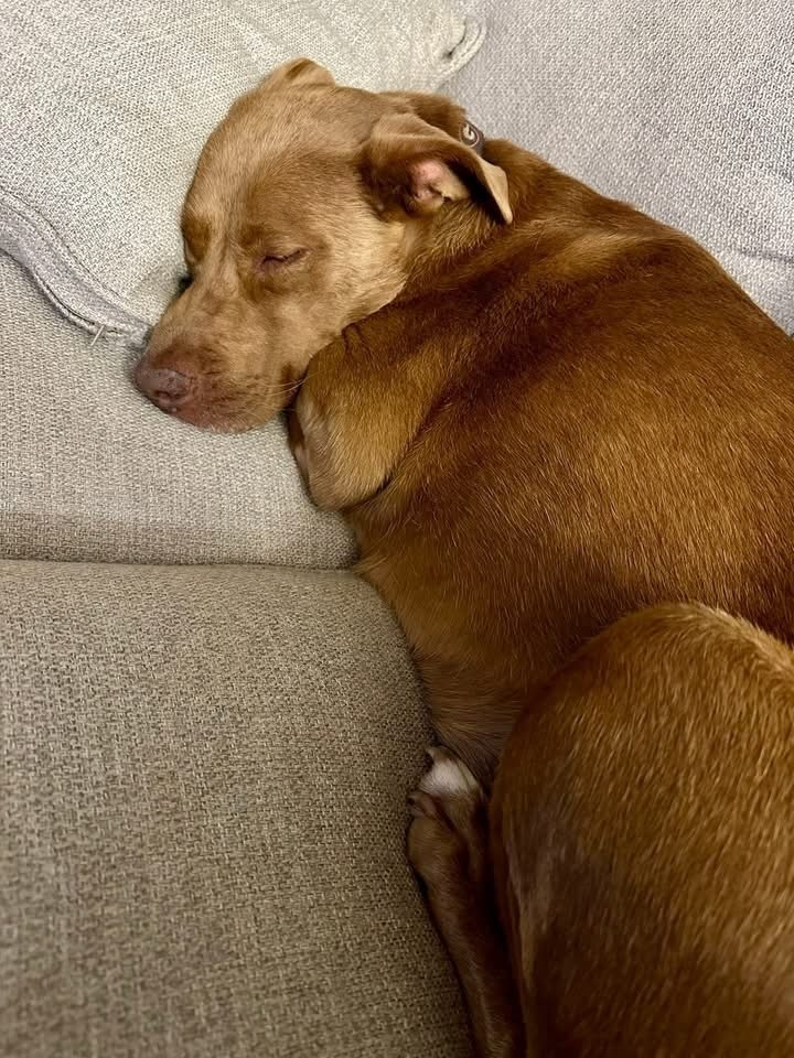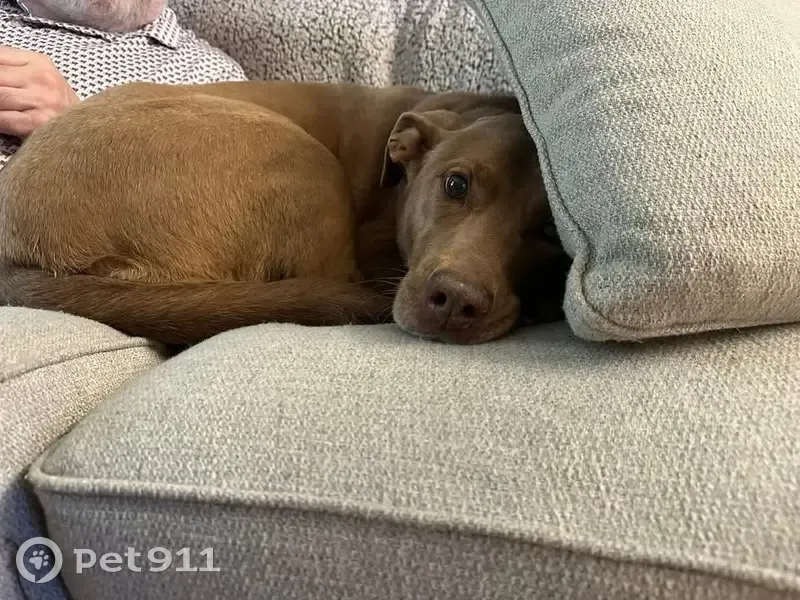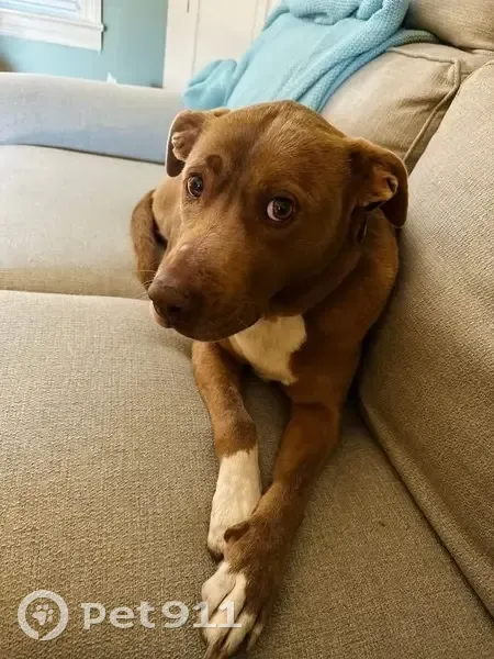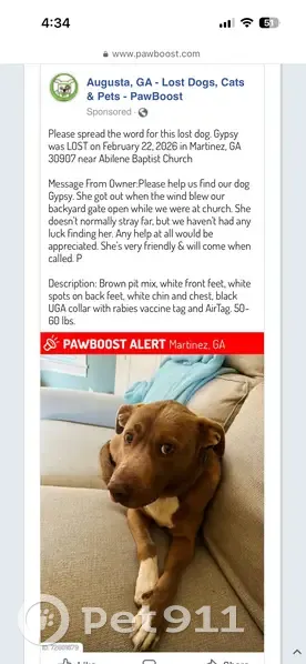 Brown pit mix, white chin and chest, white front paws & white spots on back paws at her toes. Black UGA collar with rabies vaccine tag and AirTag. Very friendly.