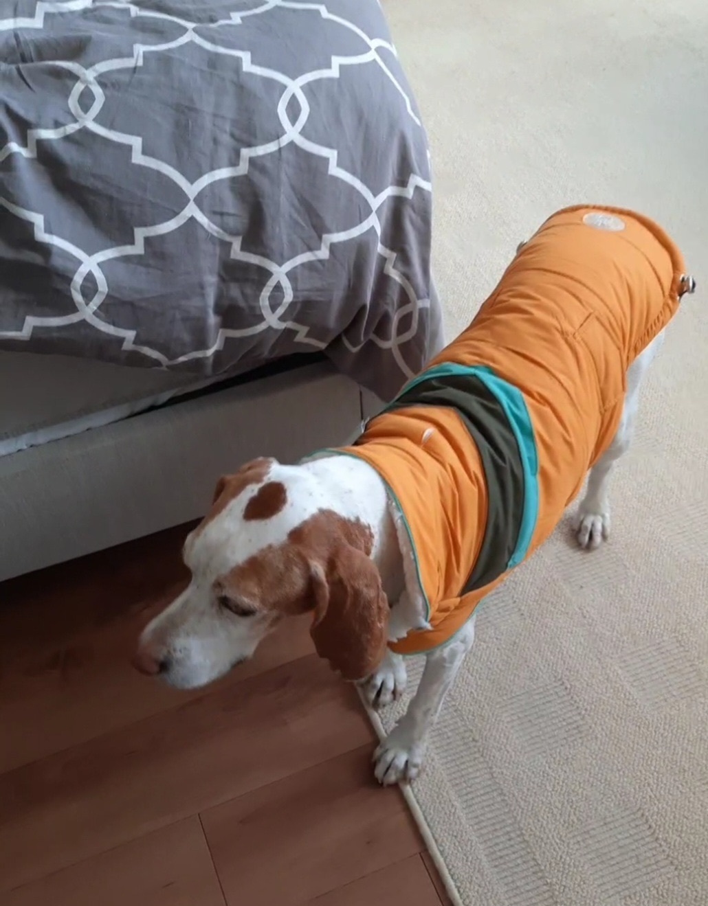 She is a small English Pointer, mostly white with orange / caramel markings. Her ears are a little scalloped due to injury She is very shy and timid. Best not to approach, or be low with food, She is wearing a yellow winter coat.
