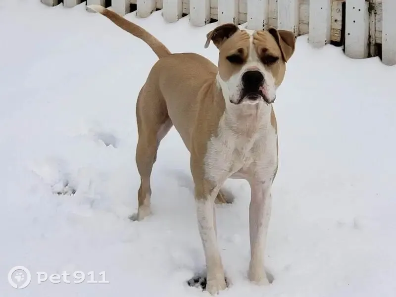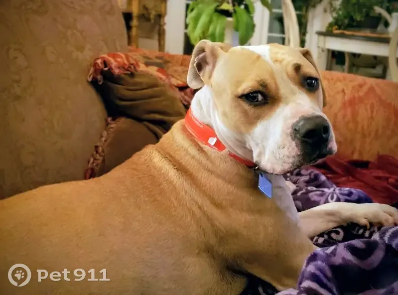 Tan coat with white chest, front legs and white muzzle. Tucker has black 'eyeliner ' around his eyes. He is small for a pitbull, approximately 45 lbs, he's 7 years old and loves kids. He was wearing a faded orange collar with rabies tag from Blueridge Animal Hospital