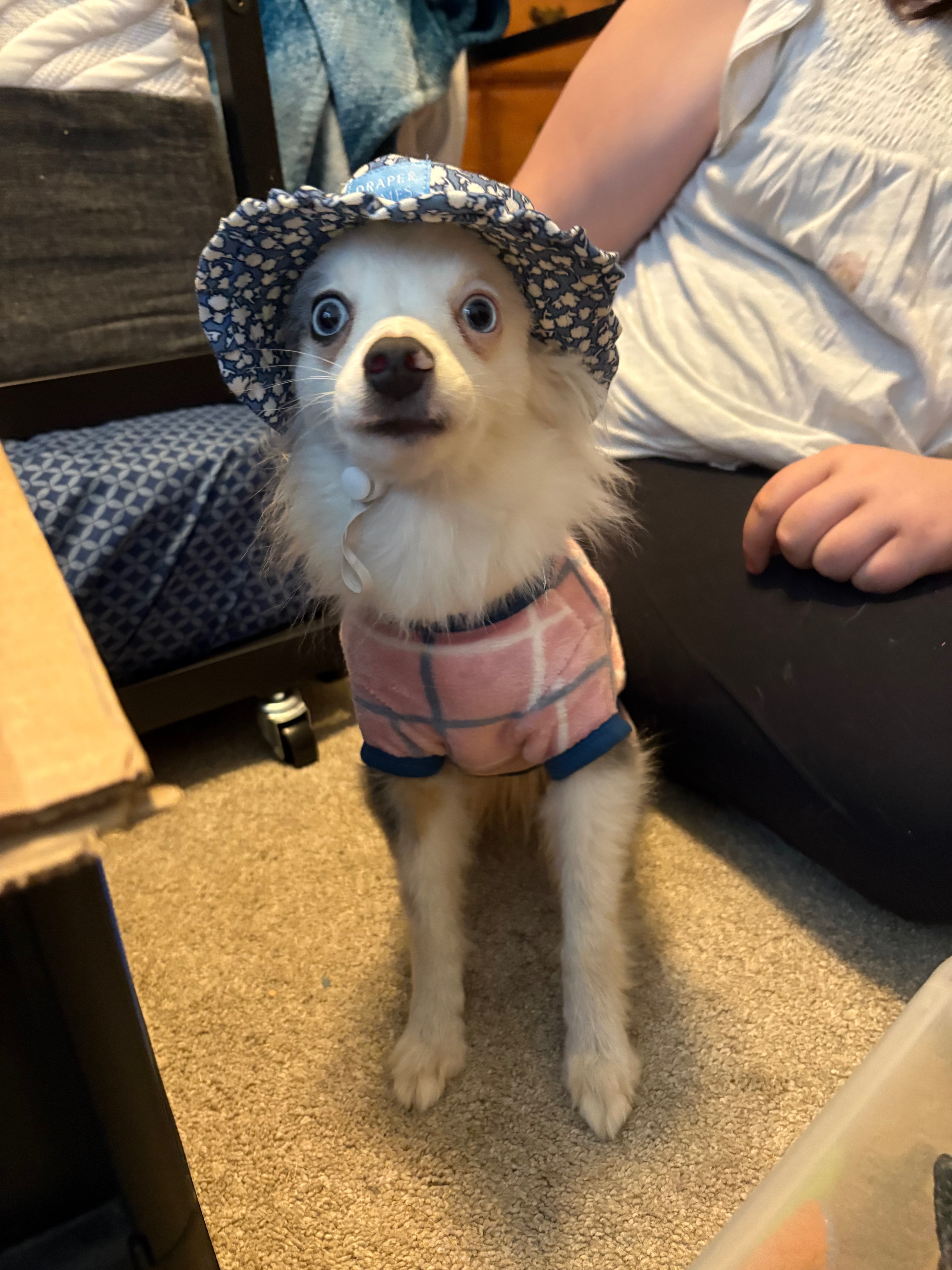 Stormy is a blue Merle and white toy Aussie with a full fluffy tail, black nose, bright blue eyes. One eye has black around it and one doesn’t. She is extremely friendly.