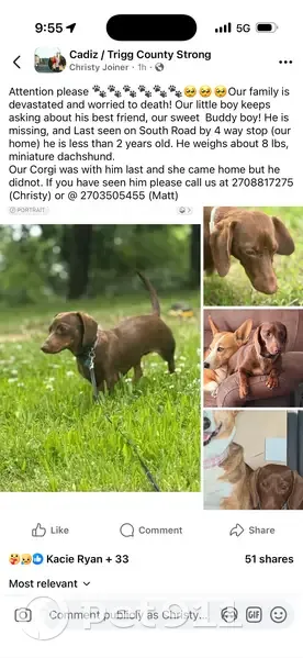 He is very small he is a miniature dachshund named buddy. He is brown and weighs about 8 lbs. He was last seen at 8 pm last night. He has a blue collar with his name and our phone number on it, Christy or Matt joiner 2708817275 He is very sweet and he is our 6 yr old sons best friend.