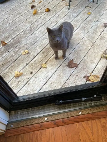 Grey coat, underside and chest has some cream and tan. White chin and mouth. Long white whiskers. Big green eyes. She is very friendly. She is sweet and smart. Usually raises tail in greeting, will accept pets from anyone.