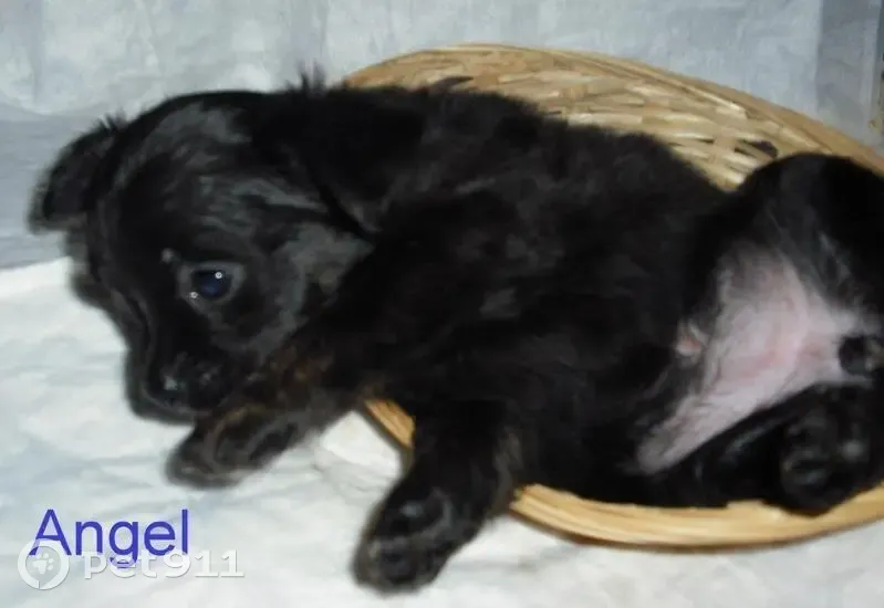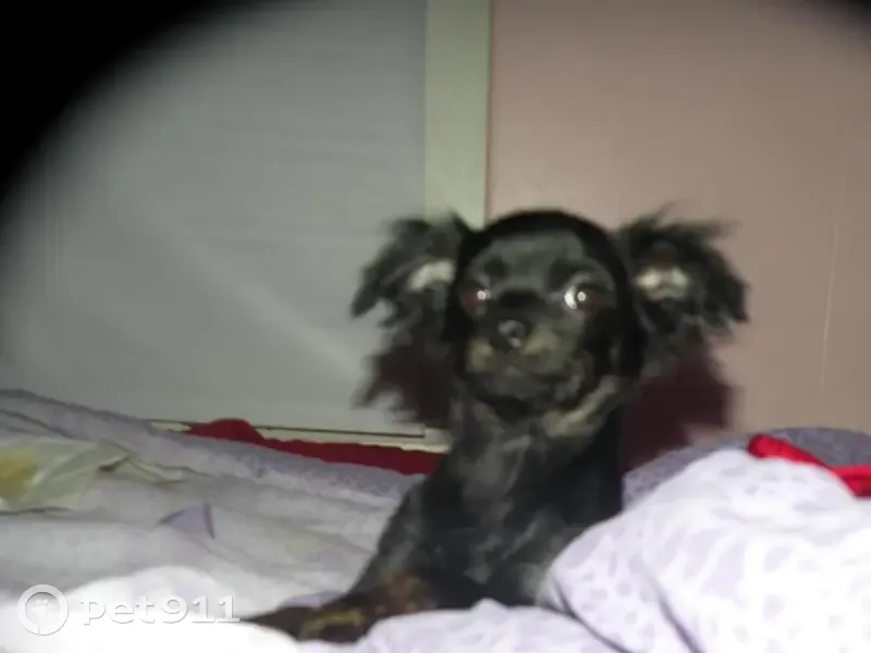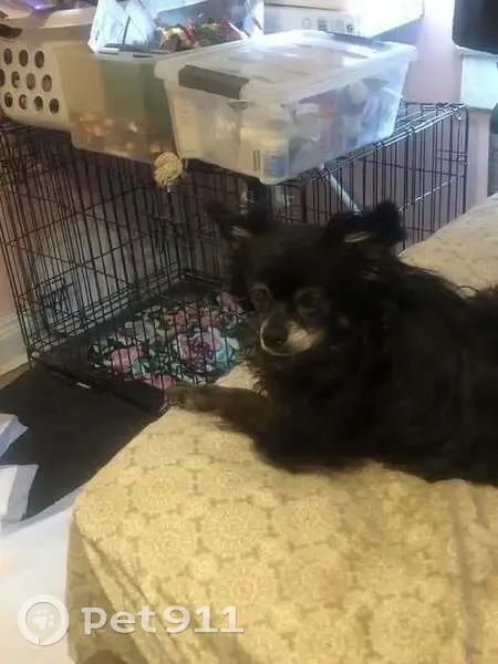 Angel is a long hair chihuahua black fur grey muzzle 13 yes old ears go up but the droop at the tips she has a bushy clurl tail and has a scar on her belly where she had hernia removal surgery and was fixed as a puppy